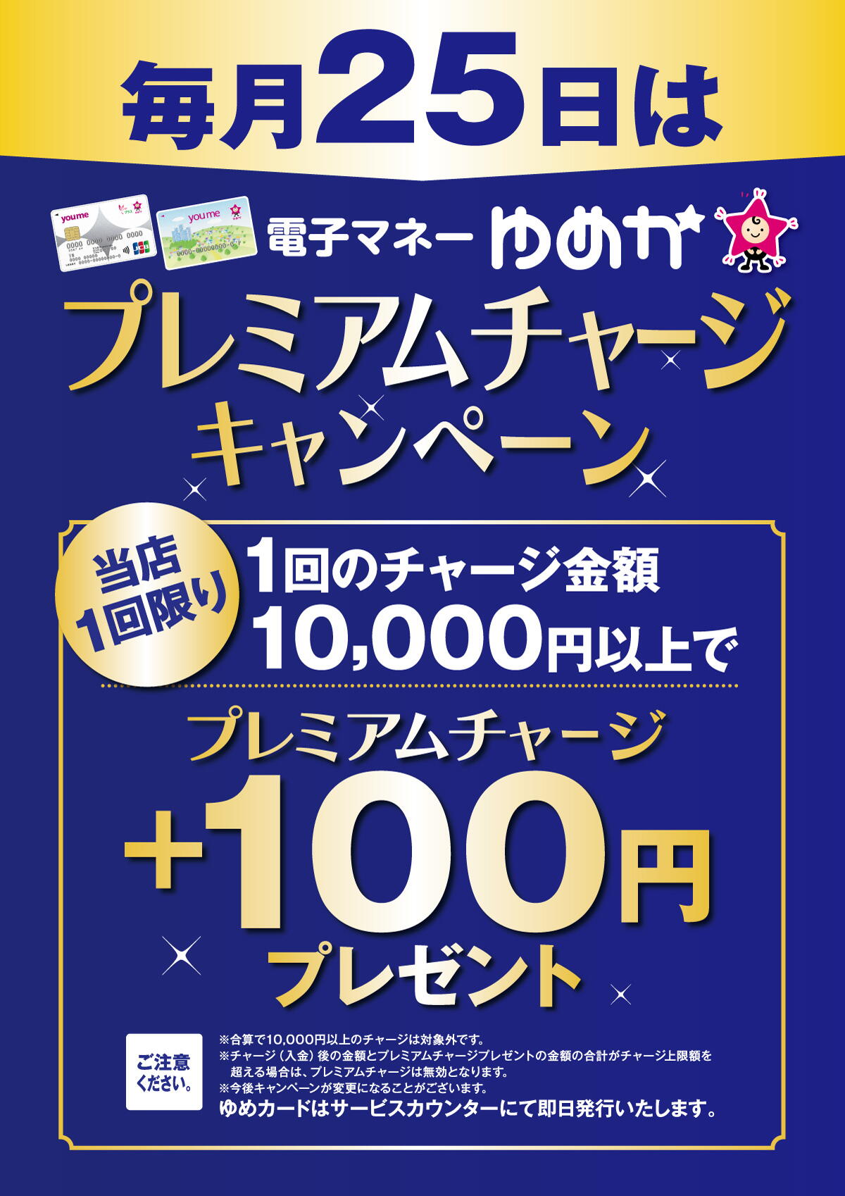 店舗総合TOP イベント/キャンペーン 毎月25日開催 電子マネーゆめか プレミアムチャージキャンペーン