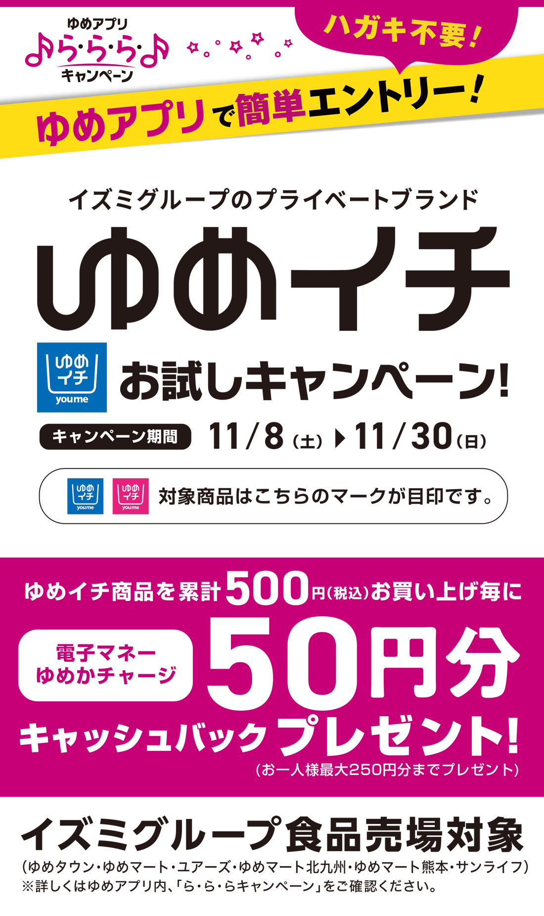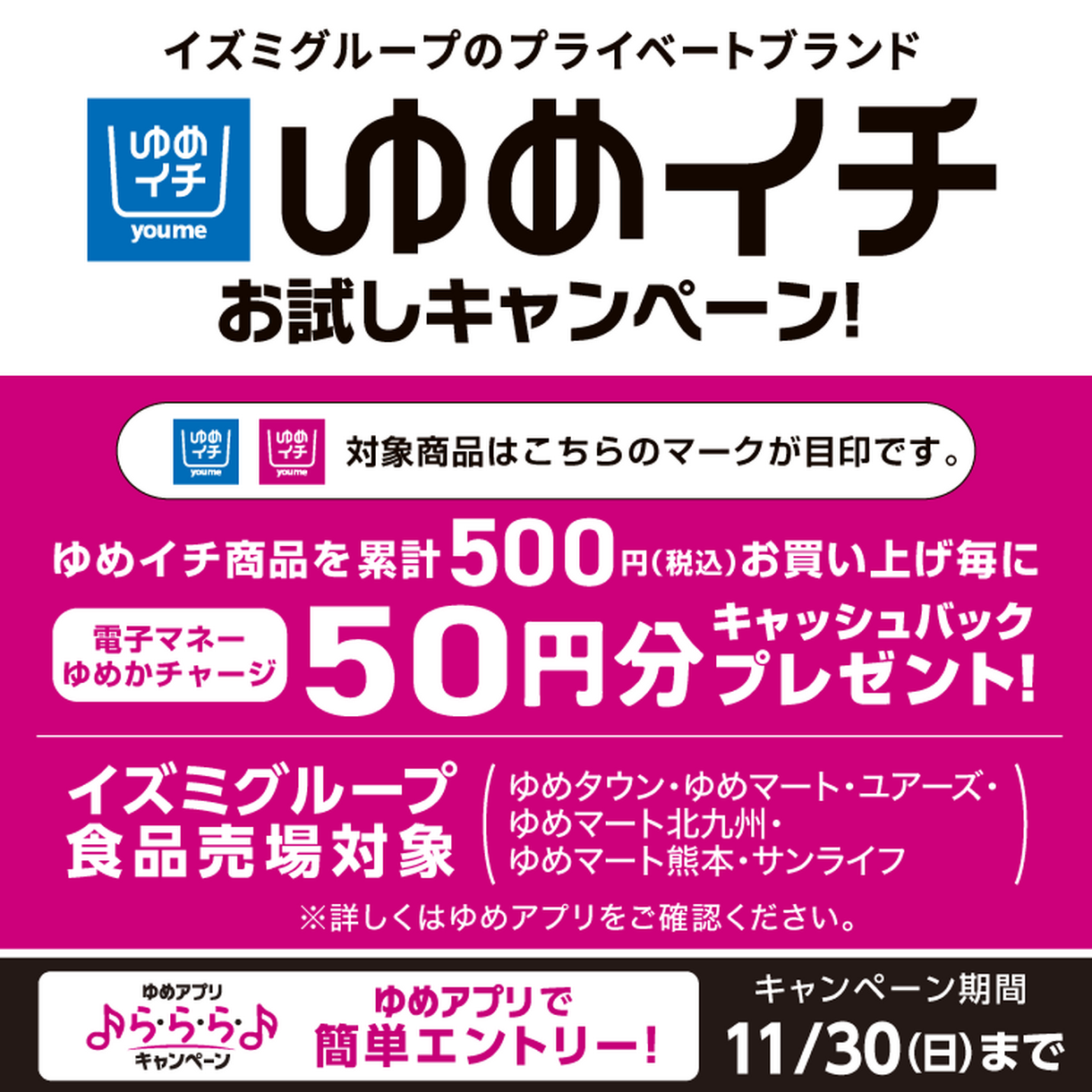 期間中、「ゆめイチ商品」を累計500円(税込)お買い上げ毎に電子マネーゆめかチャージ50円分キャッシュバックプレゼント!