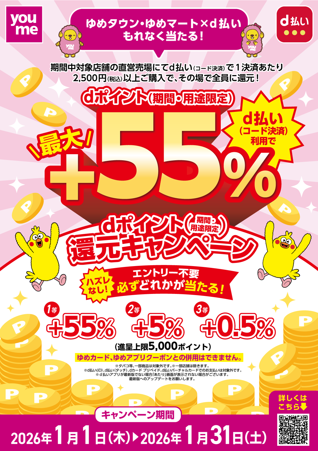 1決済2,500円(税込)以上のd払い(コード決済)が対象です。