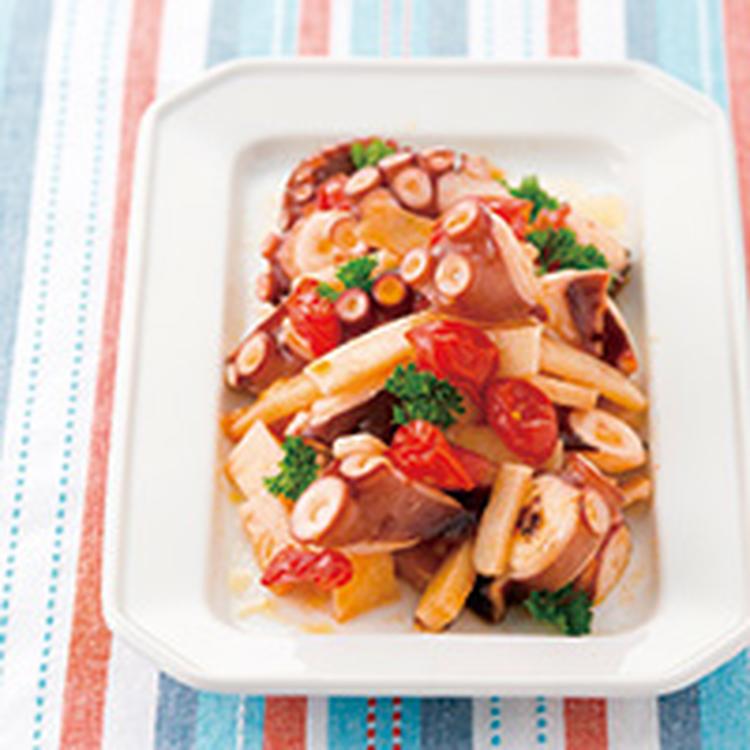 たこ・いも・トマトのガーリックソテー