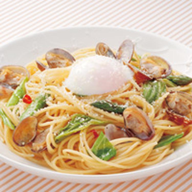 温泉玉子とあさりのグリーンパスタ