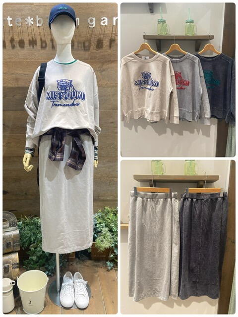 KAKELA人気のアニマル刺繍シリーズのビンテージ加工を施した『タイガー刺繍カレッジワイドクルー』と『mini裏毛切替ロングタイトスカート』です♪♪
