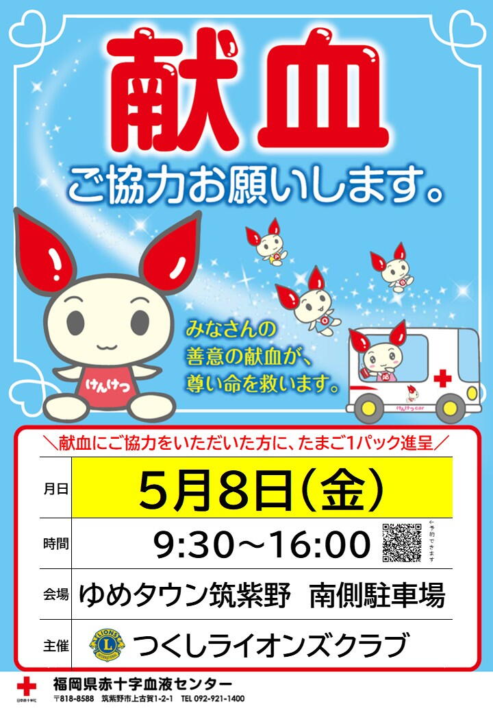 5/8(金)ゆめタウン筑紫野にて献血を開催いたします。