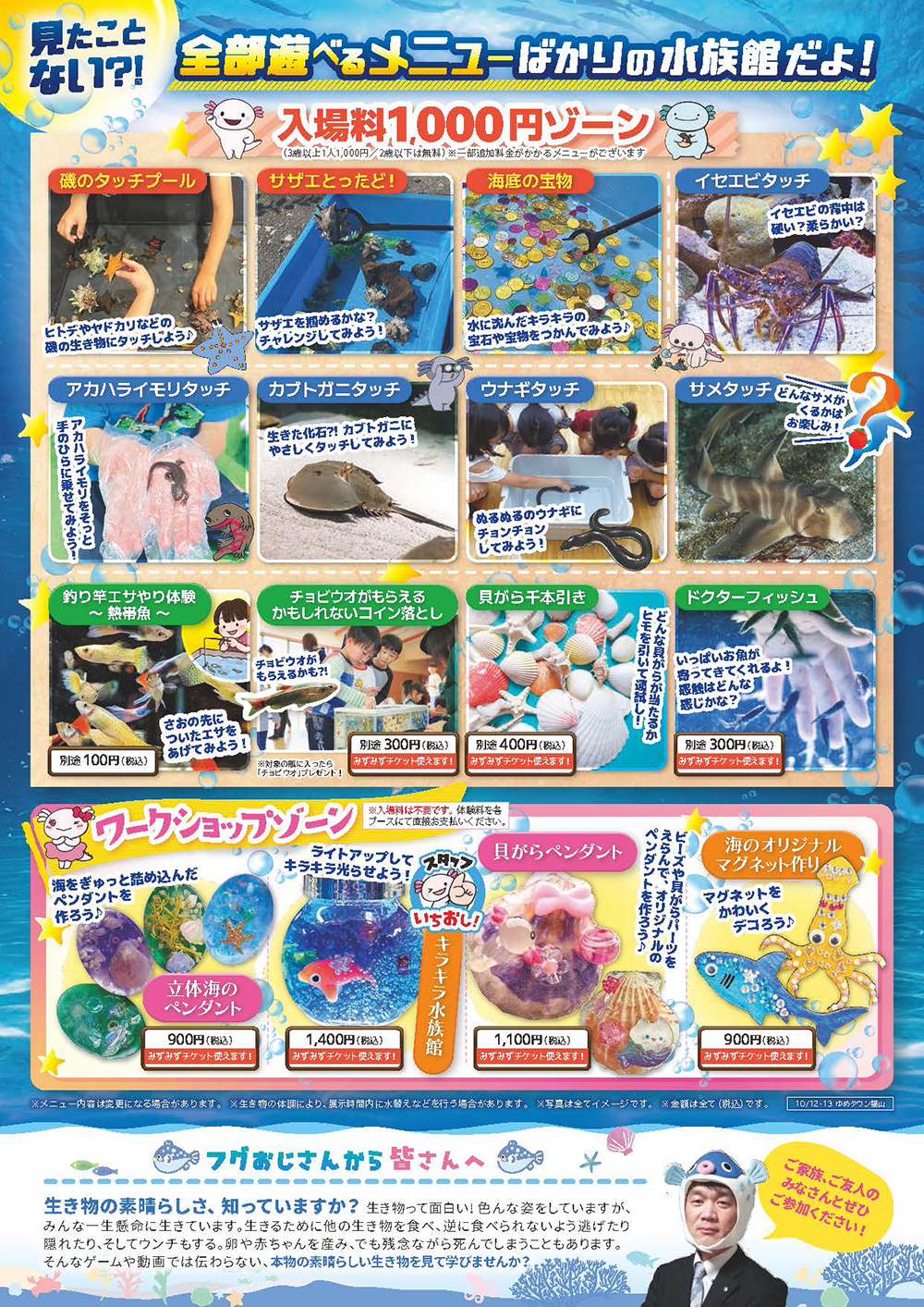 イセエビやサメなど普段触れ合うことのできない水辺の生き物と触れ合って遊べる移動水族館です。