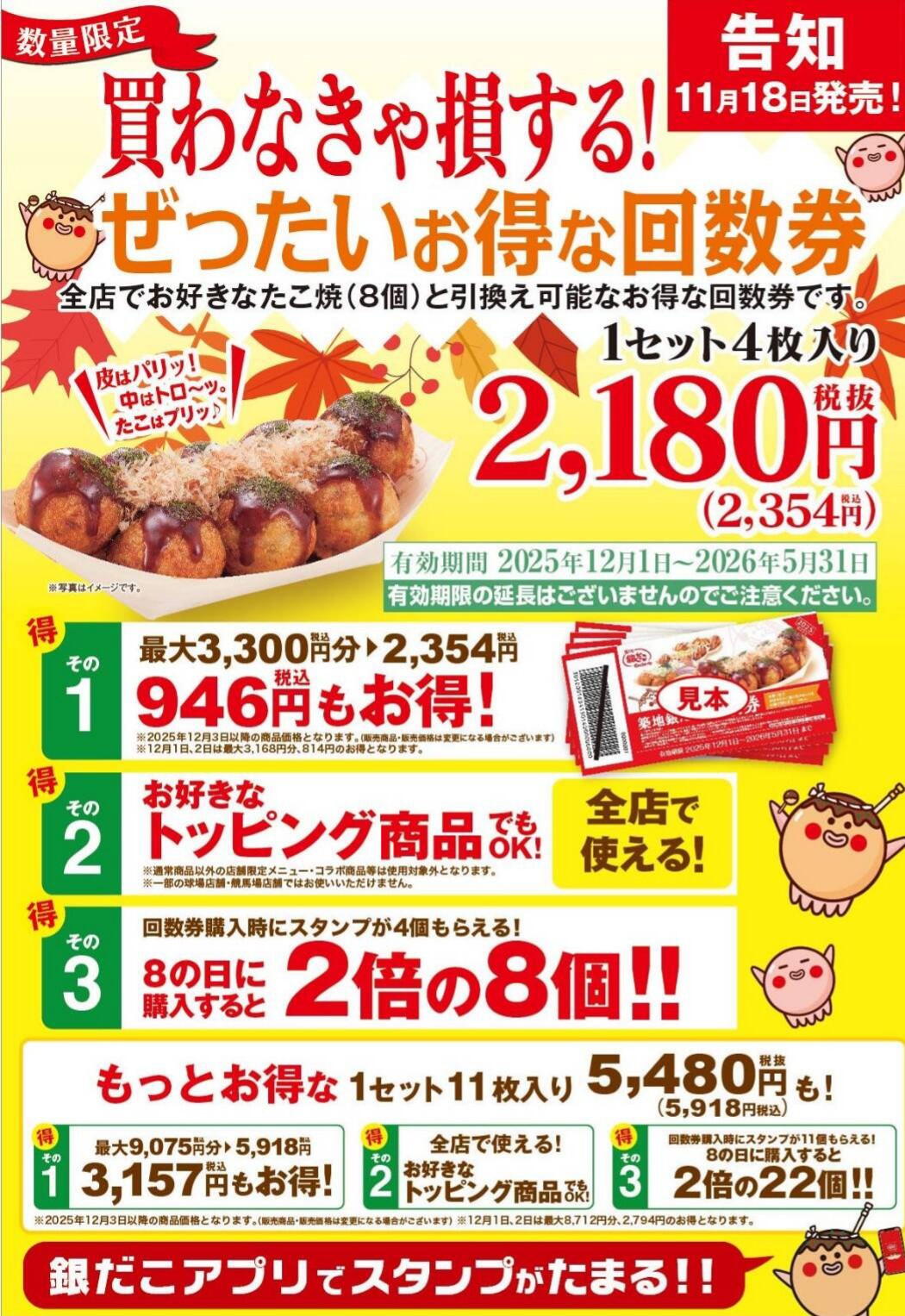 2025年11月18日(火)より、全国の築地銀だこ店舗(一部店舗を除く)にて、『ぜったいお得な回数券』 を、期間・数量限定で発売いたします!