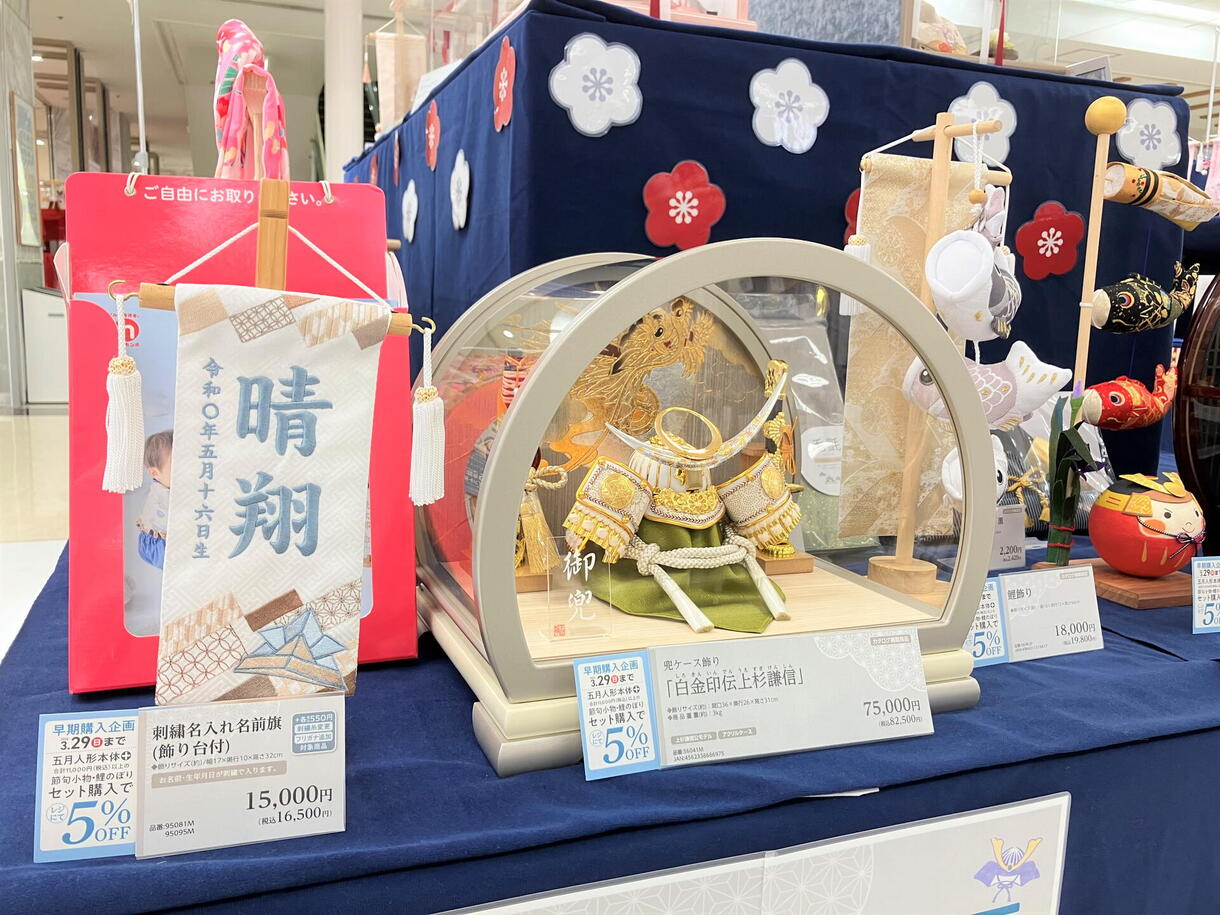 期間中に「五月人形本体」と「税込11,000円以上の鯉のぼり・節句小物(名前旗・鯉飾り・陣羽織)」を