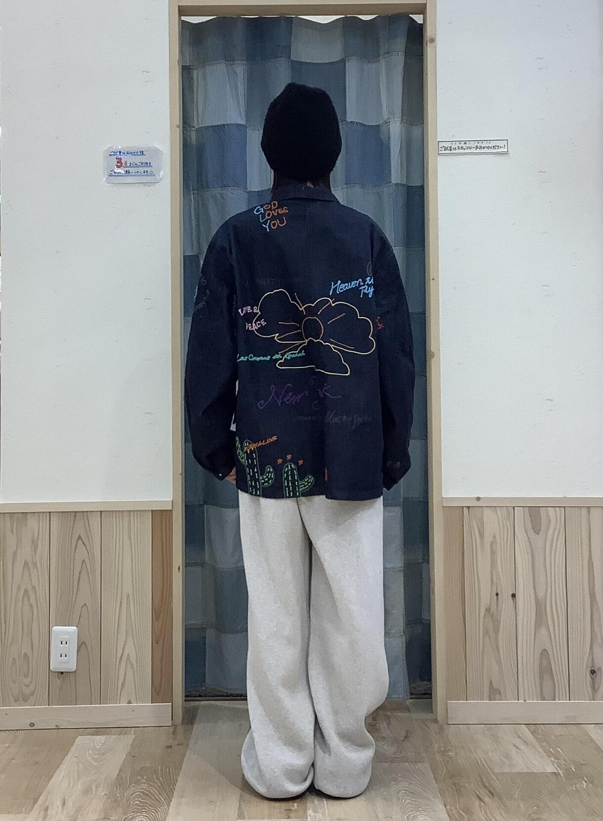 ワーク感のあるデニムに、落書きアート風の刺繍とプリントを大胆に施した他にはない一着です。
