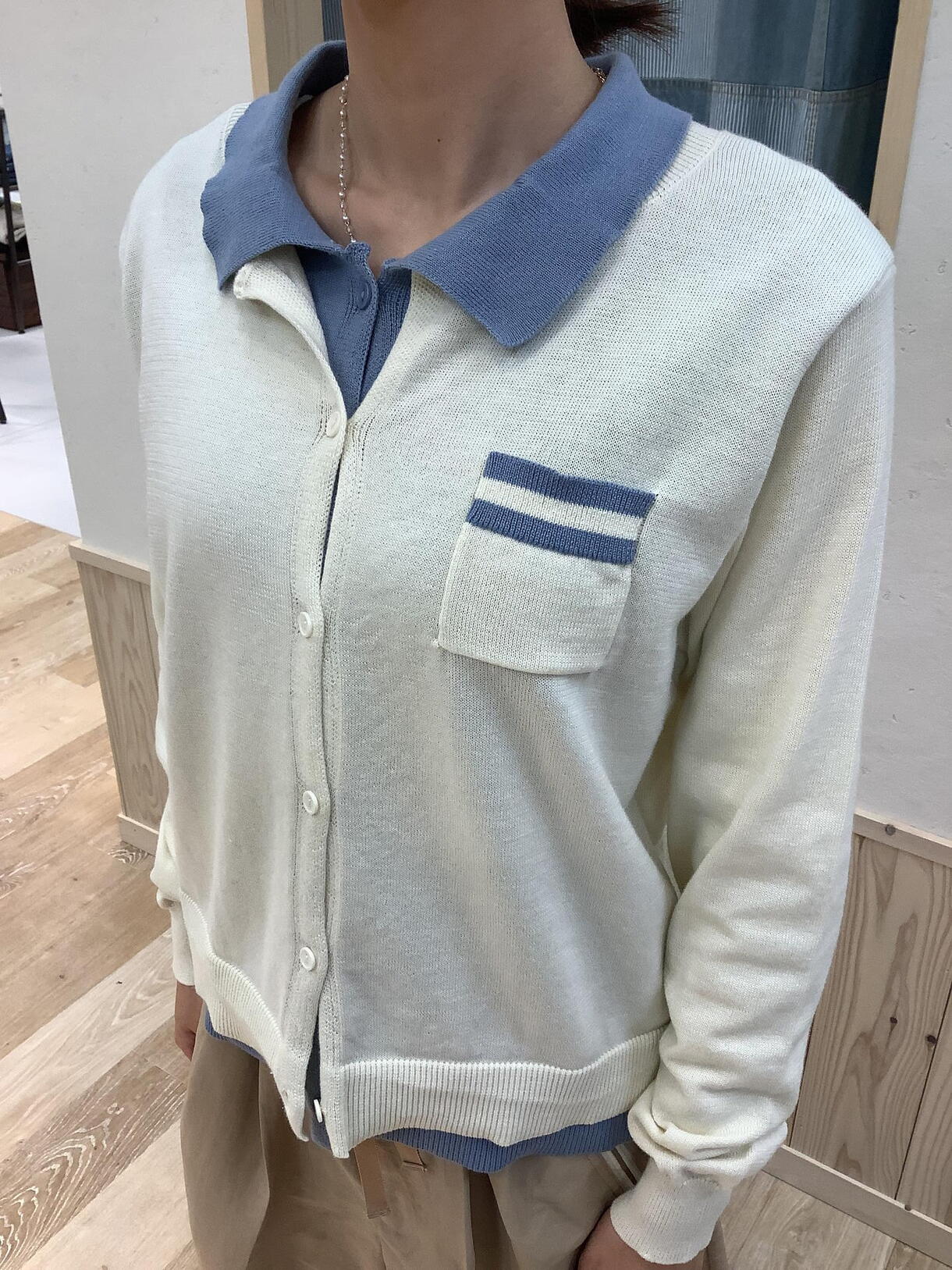 ポロカラー×配色ラインが旬なムードを演出するドッキングニットカーディガン。