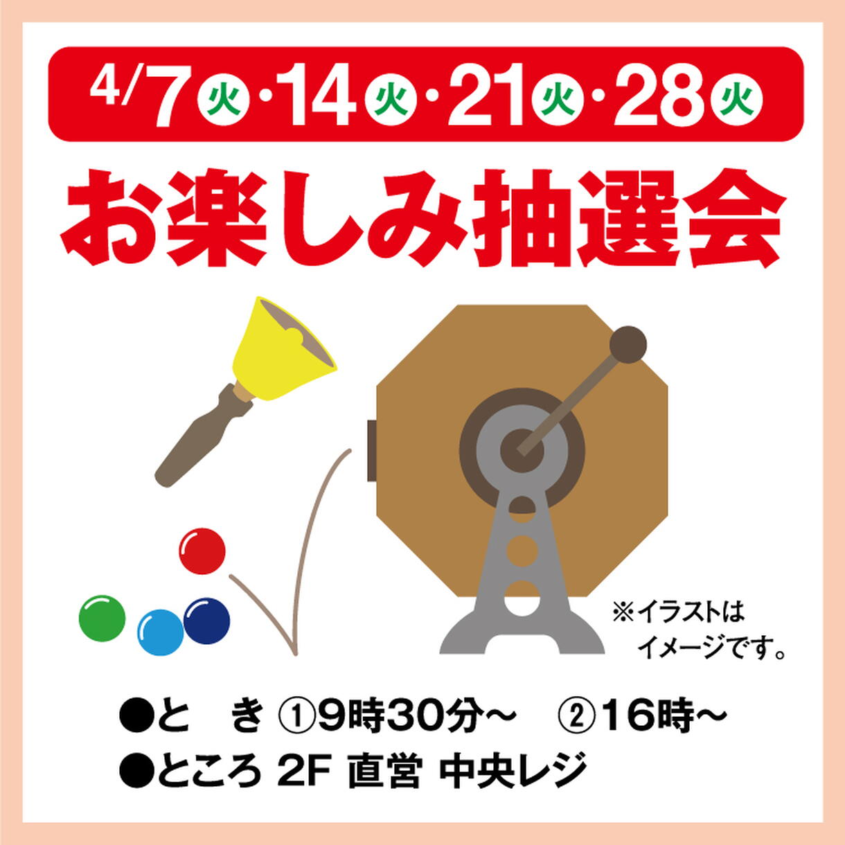●期間 4/7(火)・14(火)・21(火)・28(火)