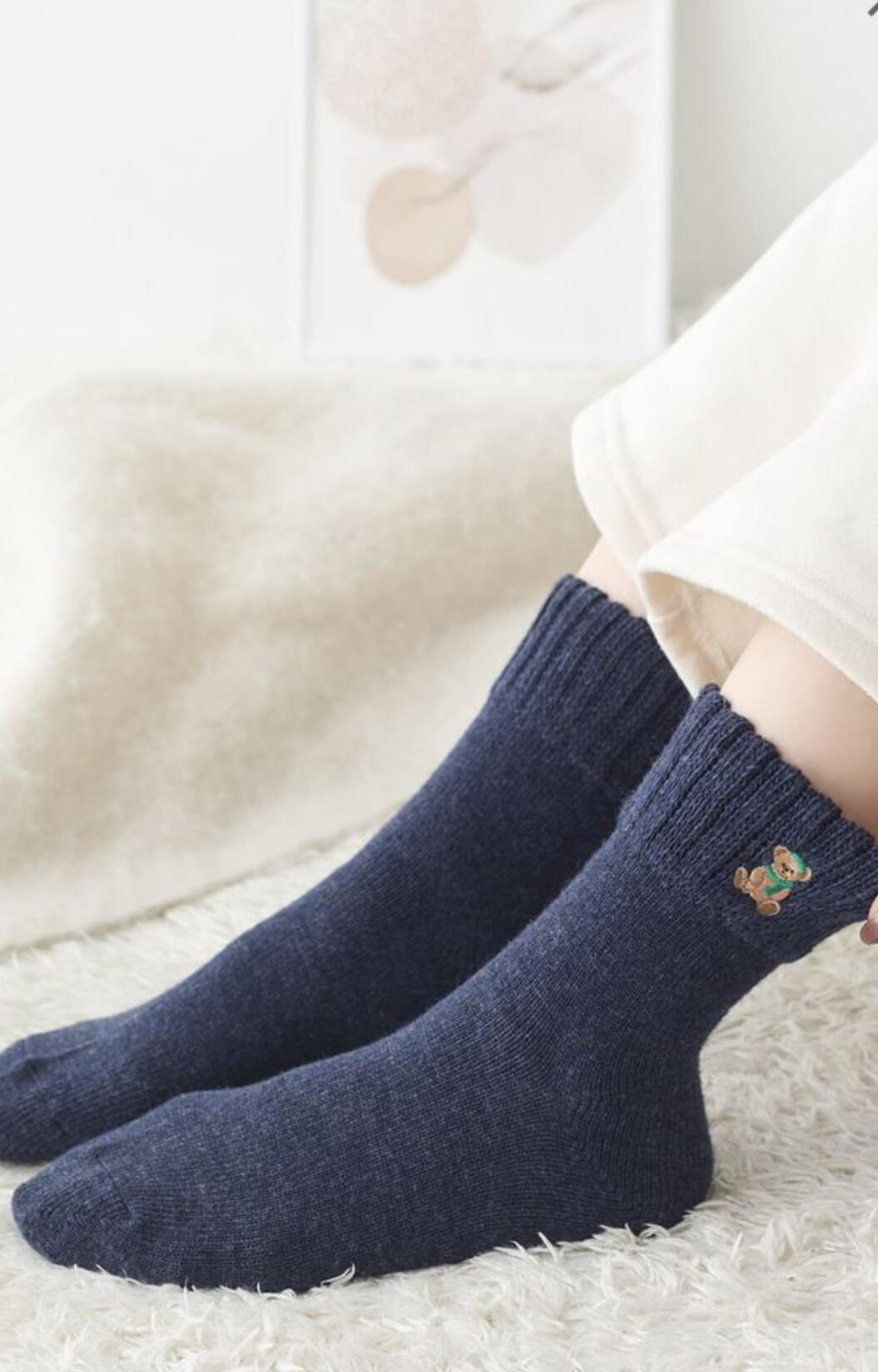 くま刺繍がワンポイントのカシミヤ混アメリブソックス。