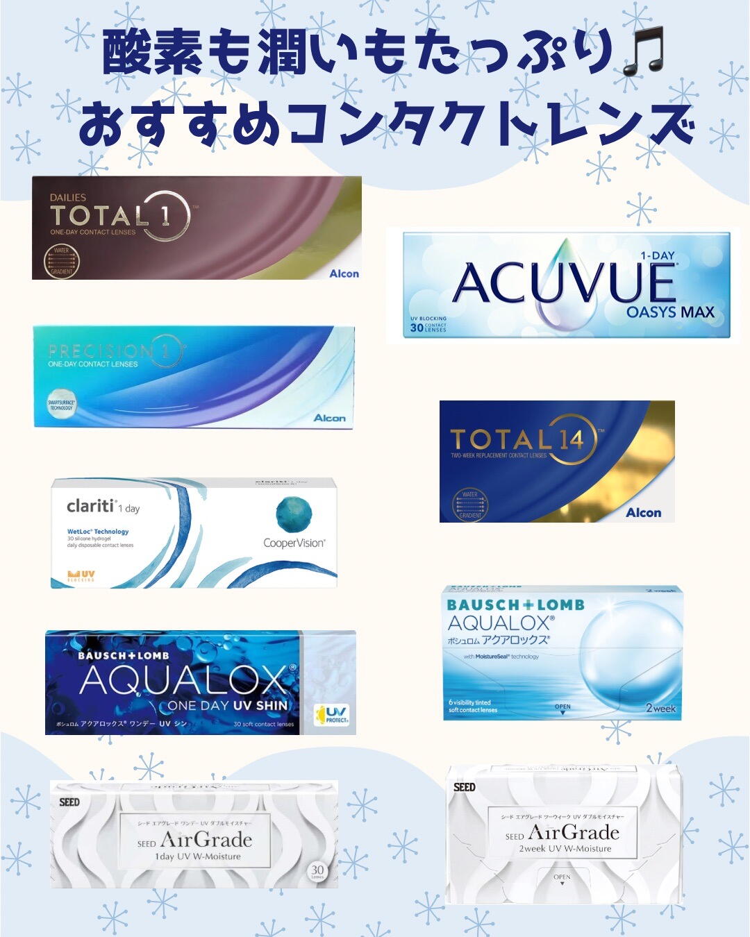 コンタクトレンズ用目薬を使ってみたりつける時間をなるべく短くするのもおすすめですが、それでもなかなか改善されない場合は、思い切ってレンズの種類を変えてみるのはいかがでしょうか?^ ^