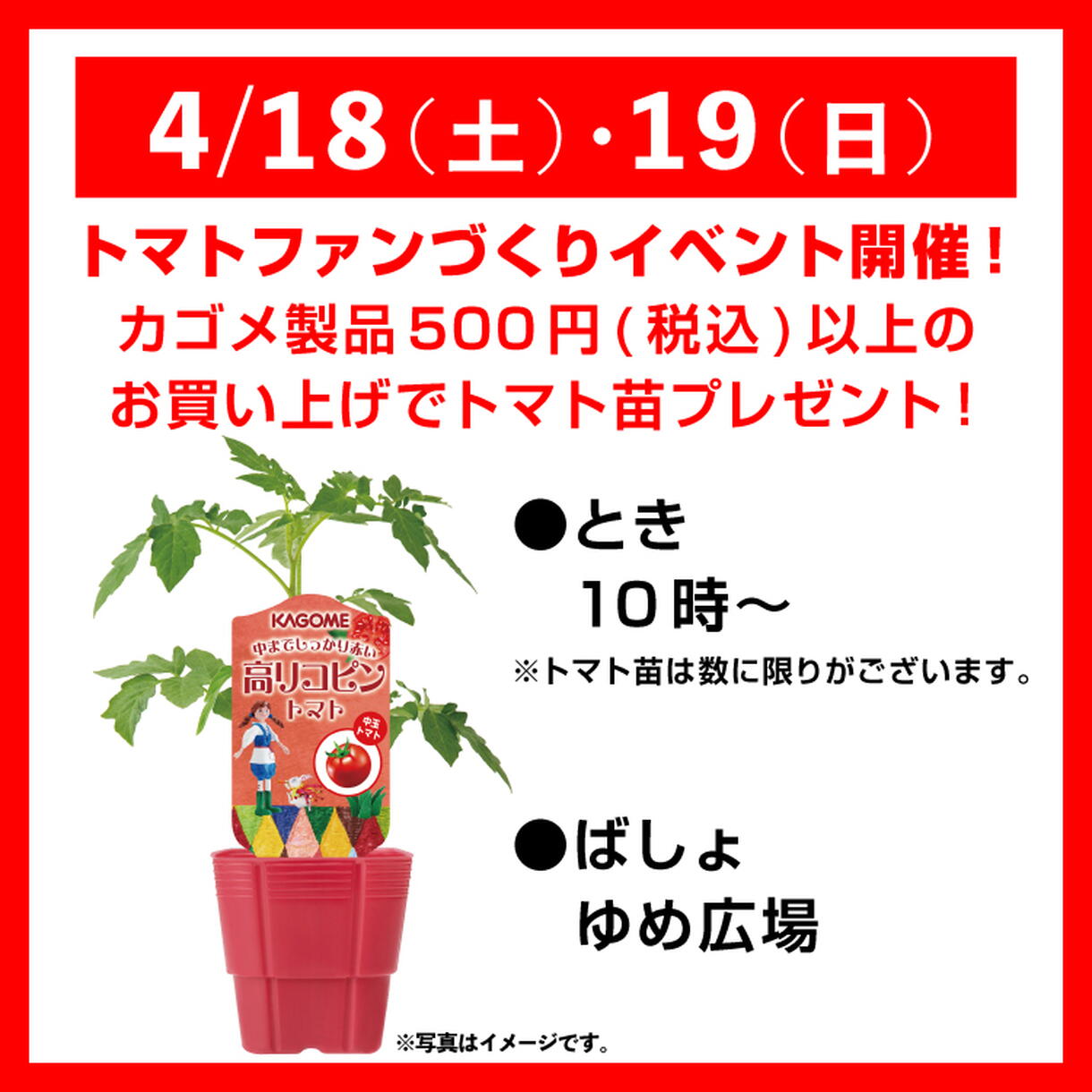 4月18日19日開催!カゴメ製品を買ってトマト苗もらおう!