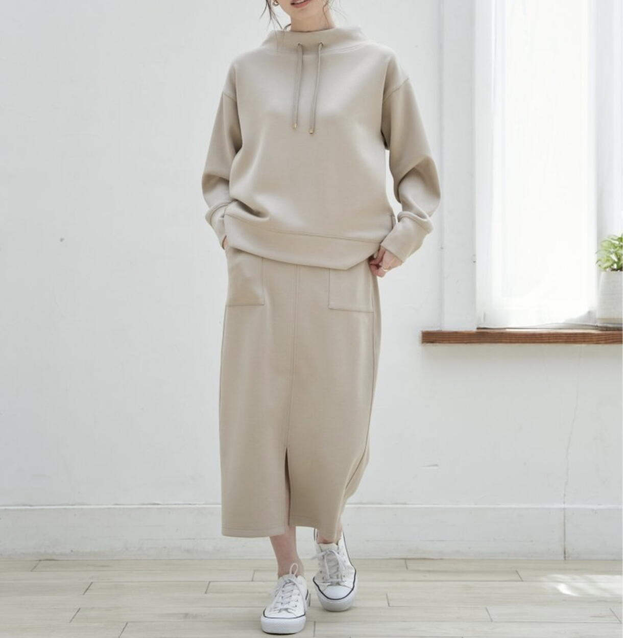 毎年大人気のダンボールニットをリニューアルした、プルオーバー×スカートのセットアップコーデ。鹿の子組織ならではのクリーンな表面感が◎