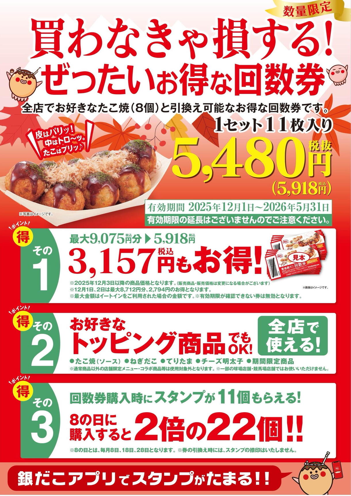 【 買わなきゃ損する?! 】築地銀だこの家計応援施策! “ ぜったいお得な回数券 ” 11/18(火)販売決定!! ~ 「全国の築地銀だこ」で使える!“お好きなたこ焼(8個入り)” をお得に楽しもう! ~