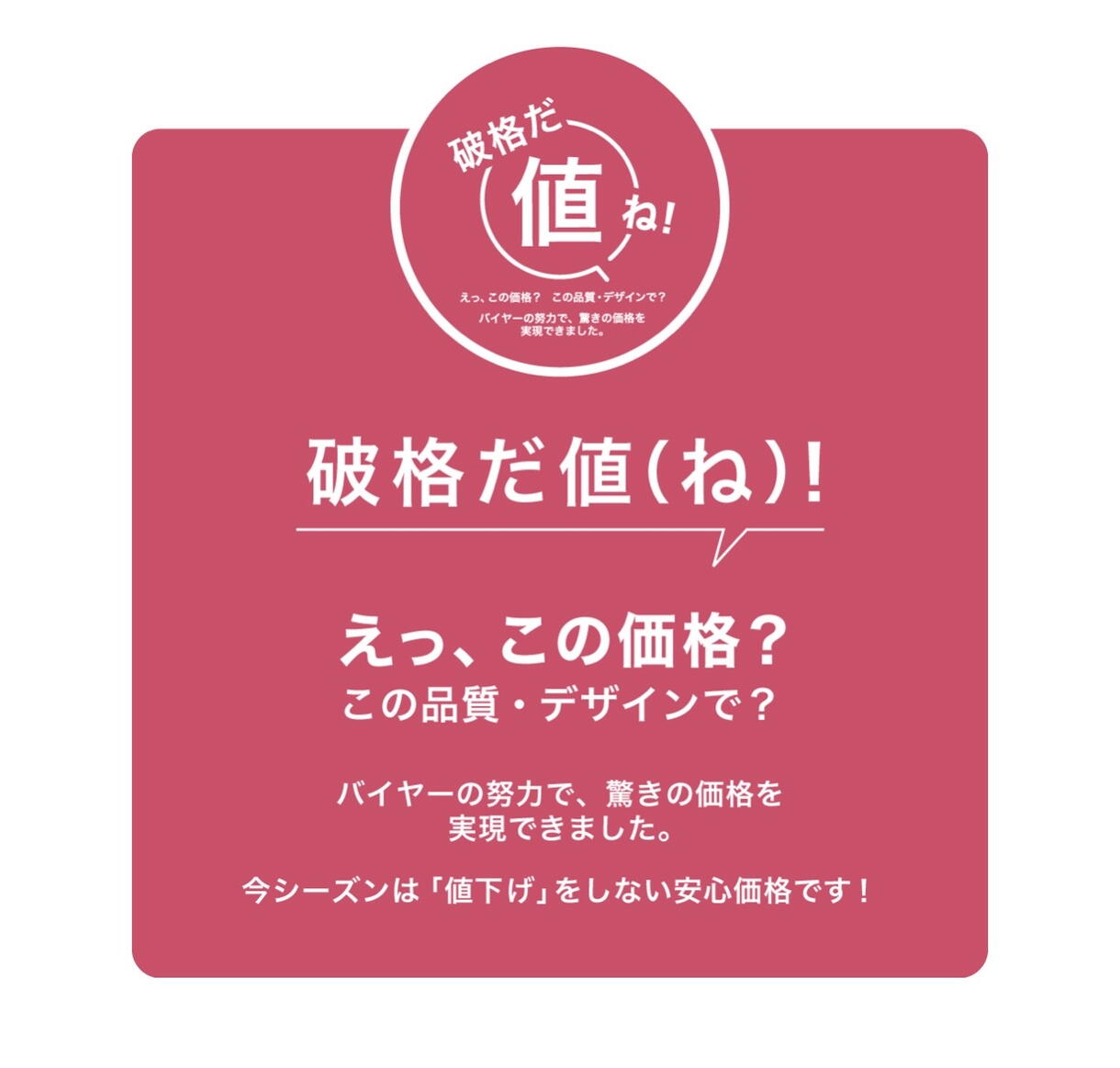 えっ、この価格? この品質・デザインで?と思ってしまうコスパの良さがポイントの【破格だ値】。