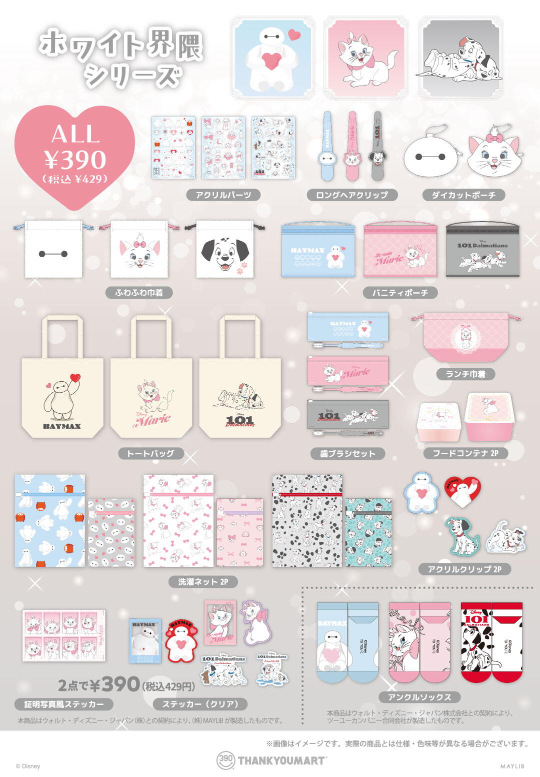 「ベイマックス」「マリー」 『101匹わんちゃん』 の限定アイテムが新登場! “ホワイト界隈”のキャラクターが大集合! デイリー使いにぴったりな 全37アイテムをラインナップ! 手に入るのはサンキューマートだけ◎ 是非、サンキューマート店舗でチェックしてみてください! 【店頭販売】 ■販売開始日:2026年4月7日(火)より、店舗毎・アイテム毎に入荷次第販売 ■商品詳細 :https://thankyoumart.jp/collections/disney-white ※ご来店のタイミングにより在庫状況が異なります。あらかじめご了承ください。