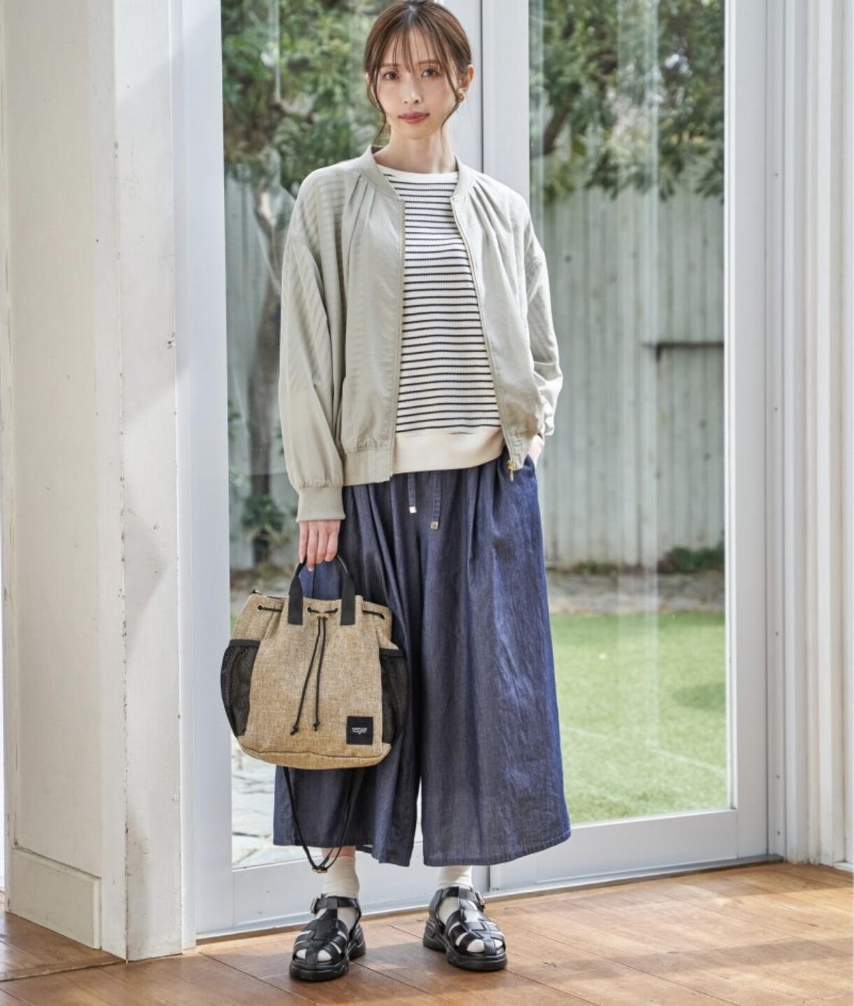 初夏のお出かけに活躍間違いなしのシアーブルゾンは、襟元のタックがつくる立体感でやさしい表情に。インナーにボーダー柄のプルオーバーを合わせ、ライトデニムのガウチョパンツで足取りまで軽くなるようなシルエットへ。夏素材の巾着バッグとソフトな足あたりのグルカサンダルで、街歩きや小旅行にも似合う初夏スタイルに♪
