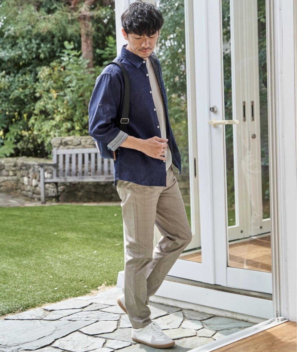 今回は【メンズ】から、雑誌「MonoMax」5月号で掲載された、デニムライクな素材で冷感機能を備えたフレンチリネンシャツを主役にした着こなしをご紹介します。