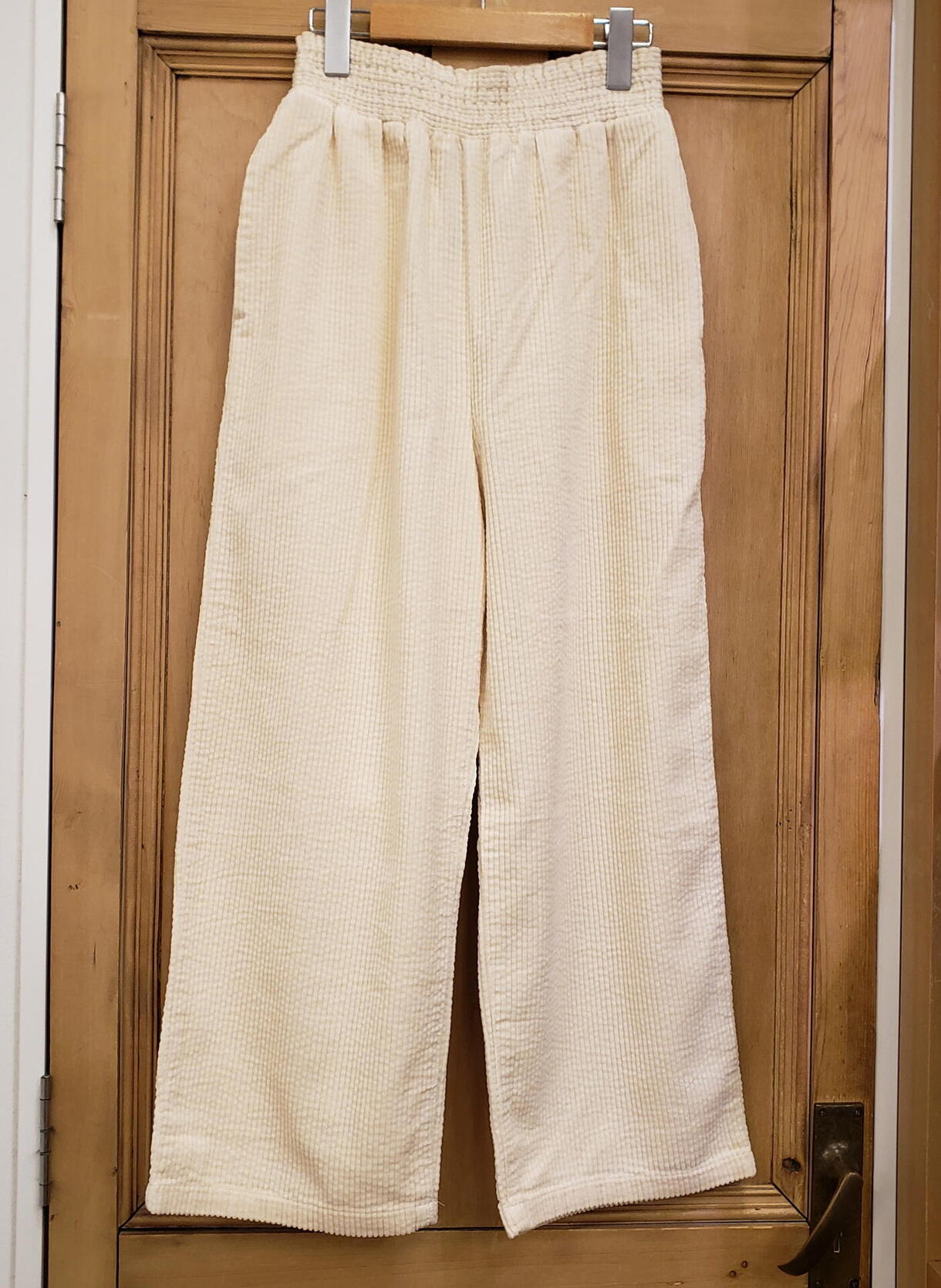 サッカーコーデュロイを使用したプルオンタイプのイージーパンツで、軽やかな履き心地と発色の良さがGOODです♪