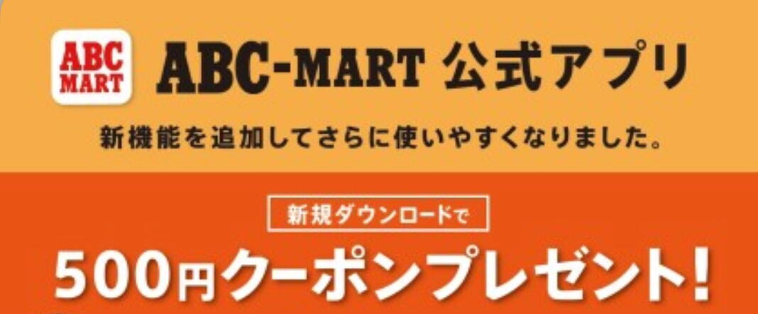 ABCマートアプリ新規ダウンロードで500円オフクーポン配布中※¥4,546(税込¥5,000)以上お買い上げで利用可能