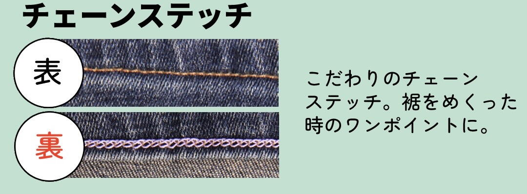 ダメージや色落ちのないジーンズにはチェーンステッチもおすすめです♪