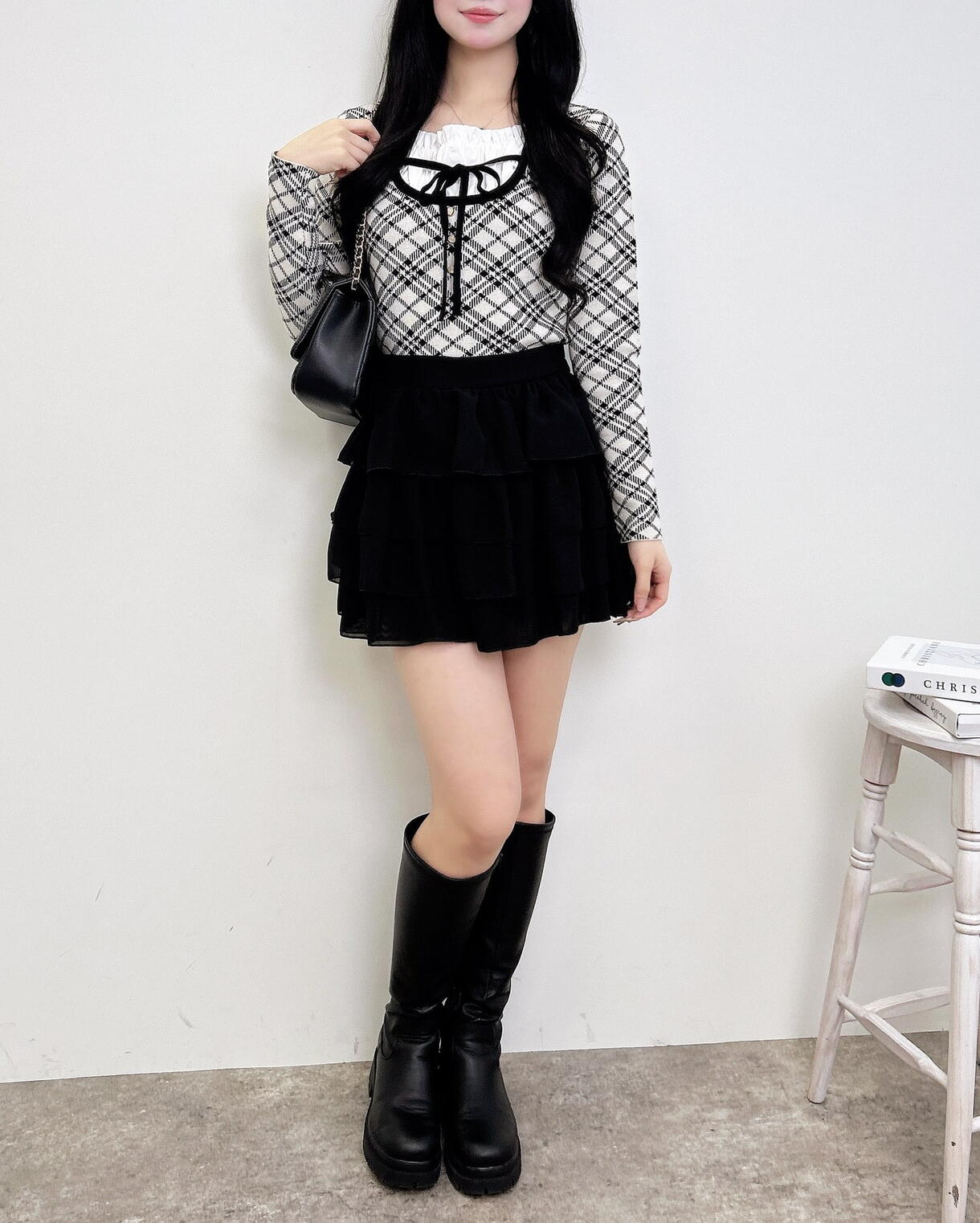 胸元のフリル×リボンがかわいい♪ドッキングチェック柄ニット