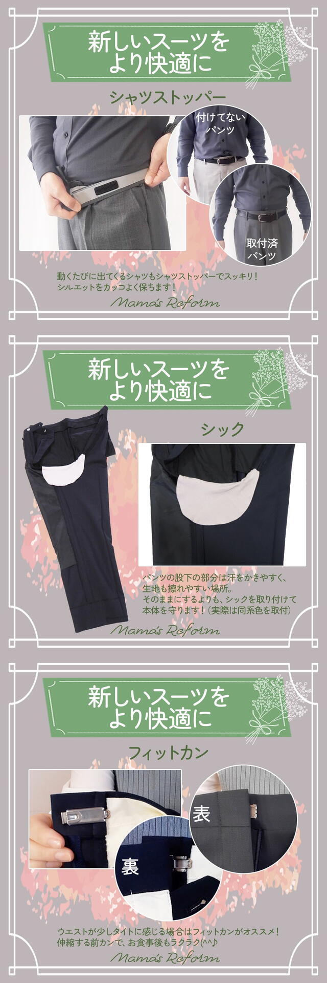 サイズ調整やお役立ちアイテムで着心地よく仕上げます。
