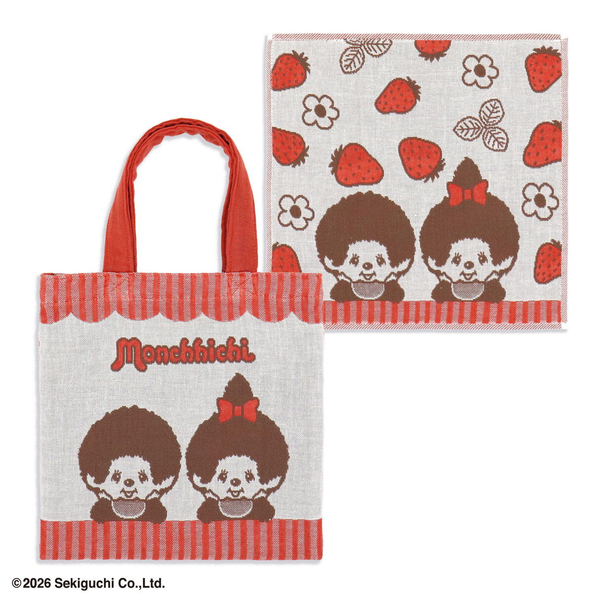 表面には、赤いストライプとスカラップ調のデザインに、ひょっこり顔をのぞかせるモンチッチたちが愛らしいアクセント。