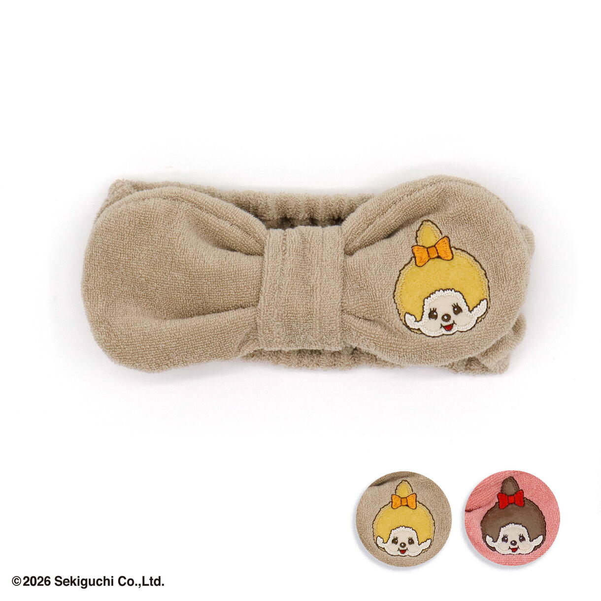無地のブラウンとレッドの2色からお選びいただけ、モンチッチの刺繍がアクセントに。