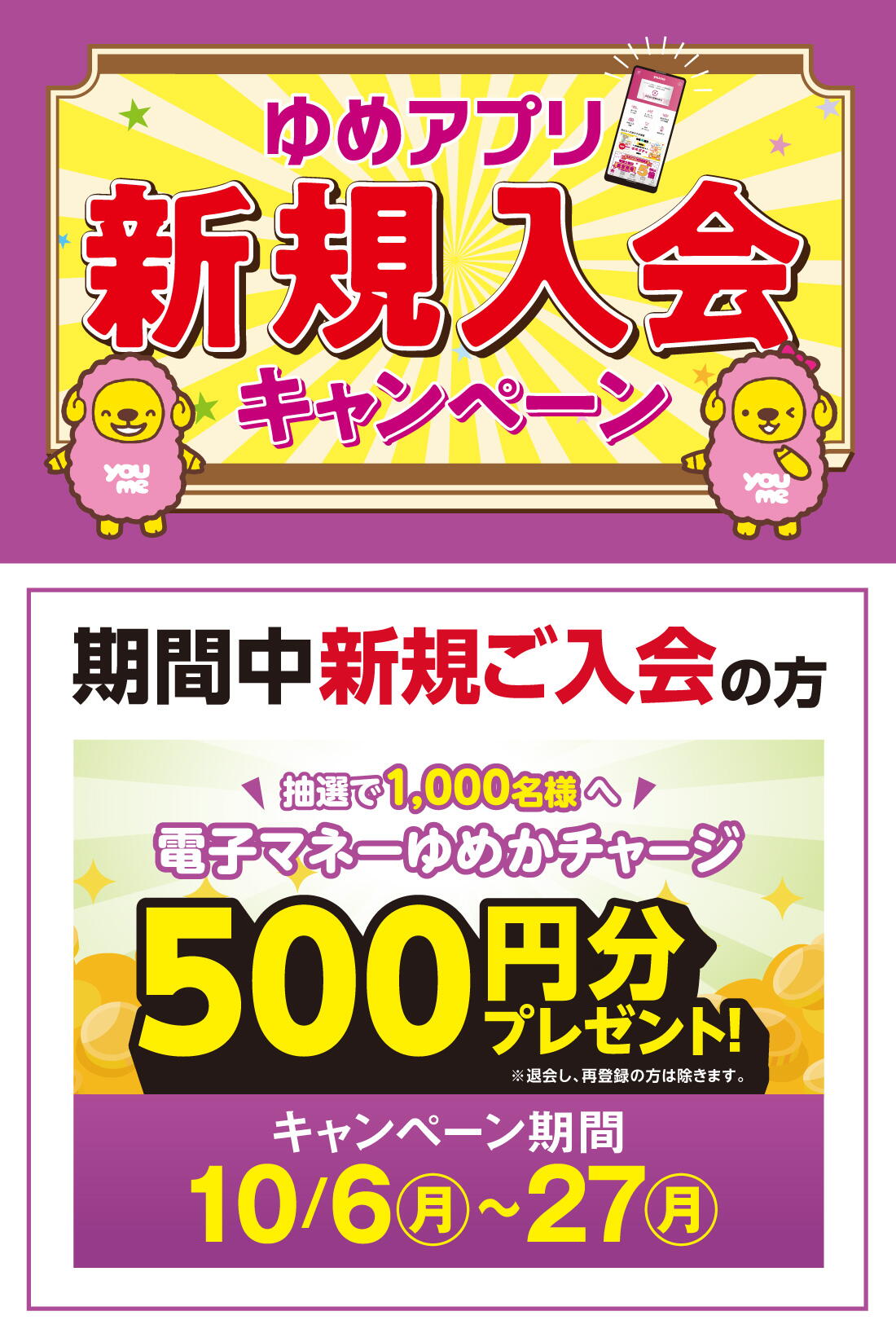 キャンペーン期間中、ゆめアプリに新規ご入会の方、抽選で1,000名様に「電子マネーゆめかチャージ500円分」プレゼント!