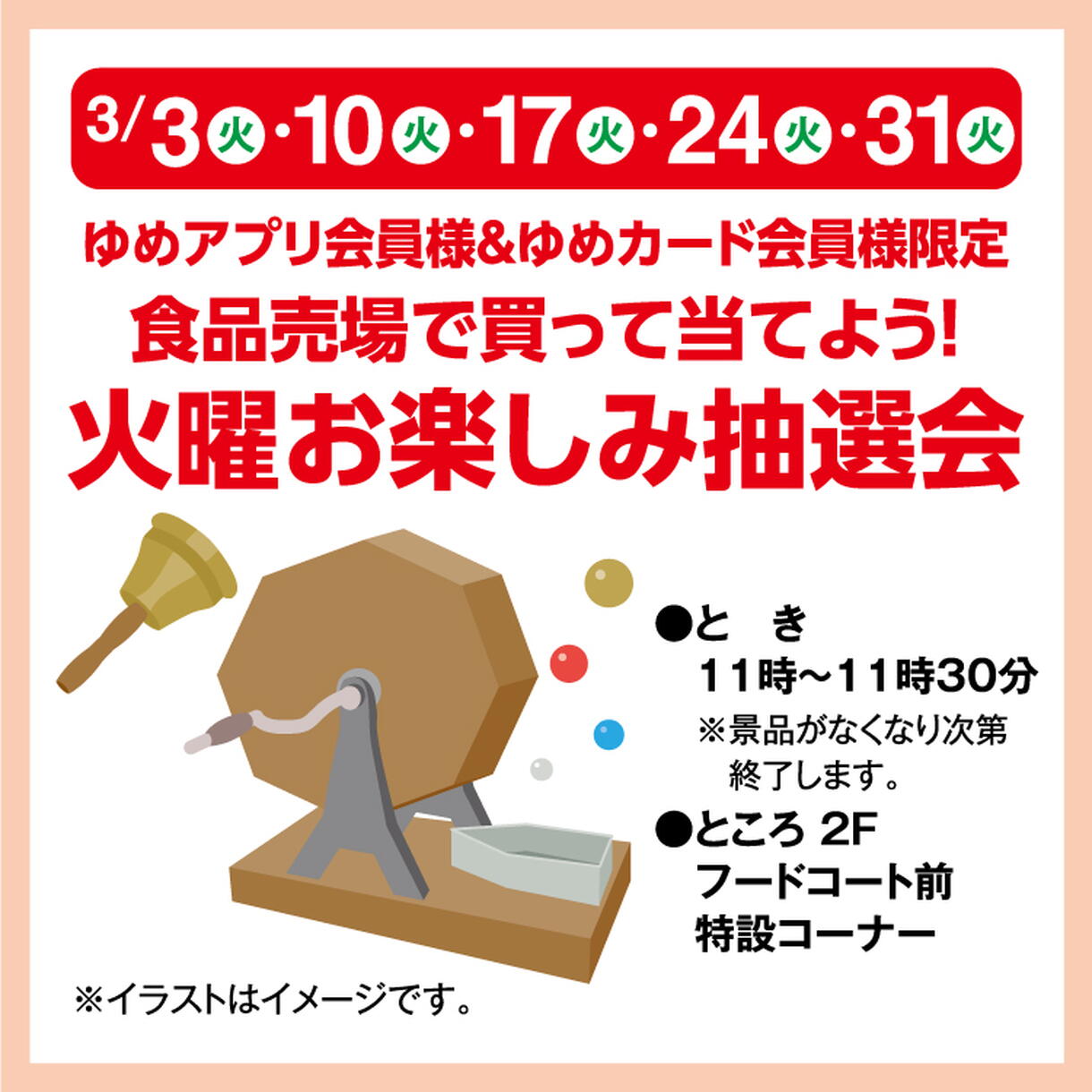 ゆめアプリ会員様&ゆめカード会員様限定 食品売場で買って当てよう! 火曜お楽しみ抽選会