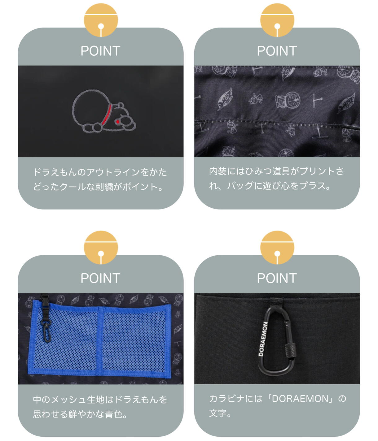 裏地やカラビナにもドラえもん要素がプリントされており、遊び心も満載。