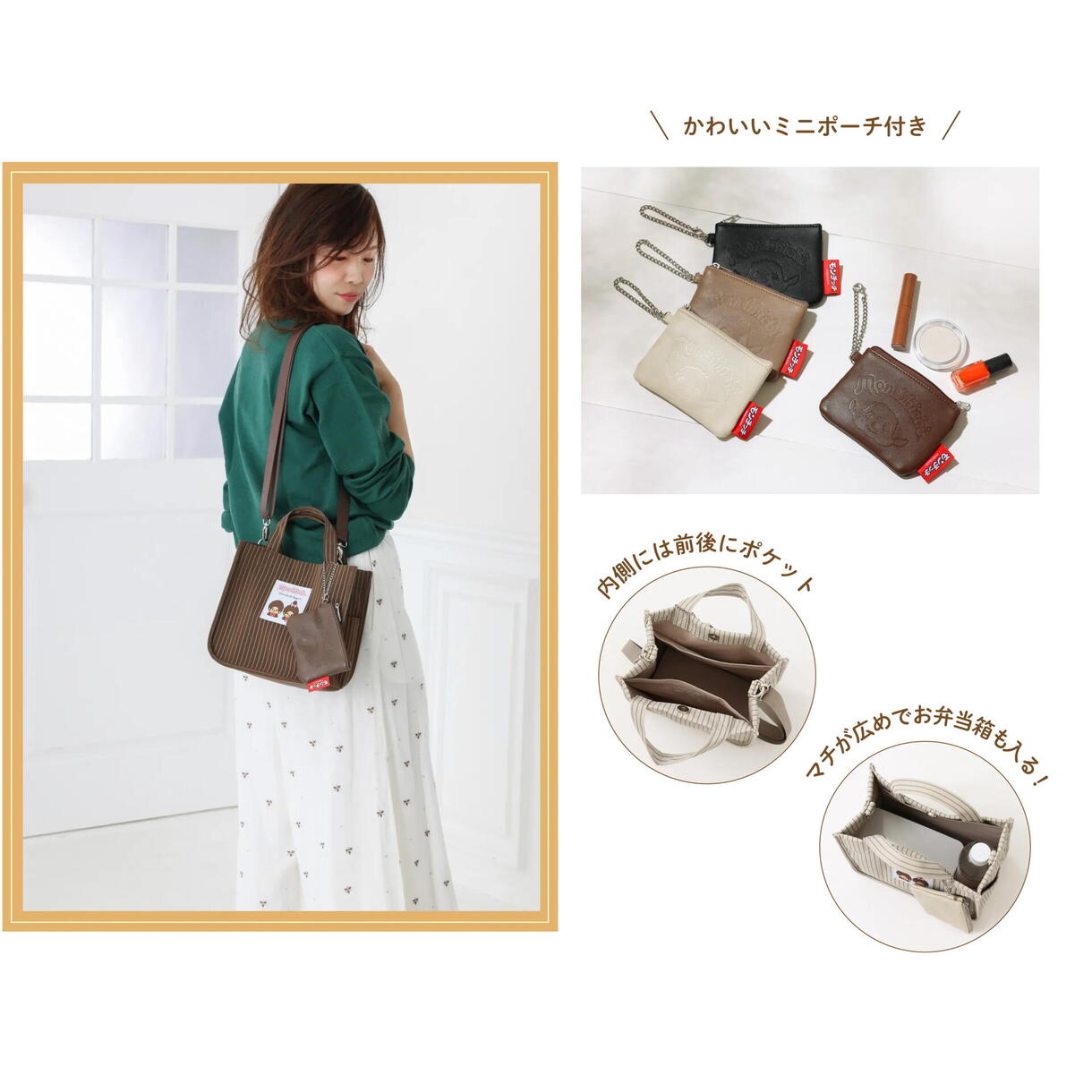 かわいいミニポーチ付きに、マチが広めなのでお弁当箱も収納可能◎