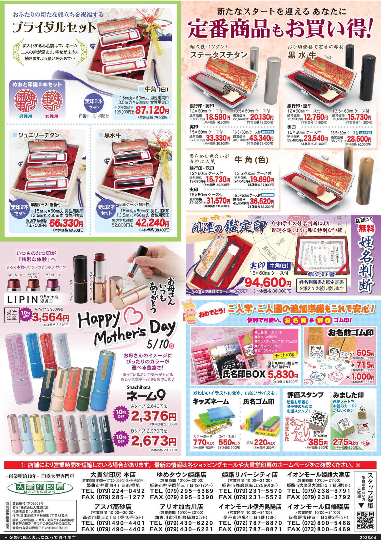 その他、色々な印材の印鑑・ネーム印・ネームペン等