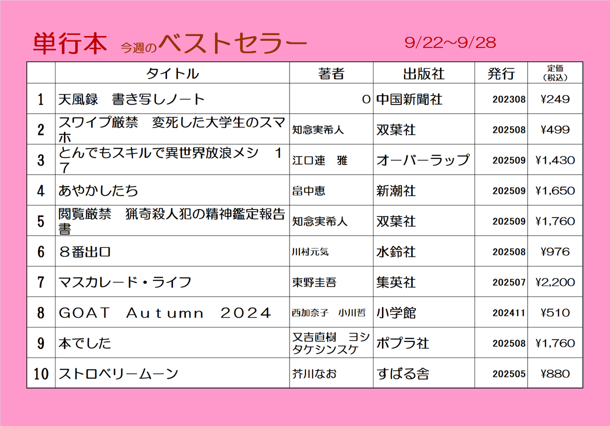 紀伊國屋書店ゆめタウン広島店の先週の売上ランキングを発表します!