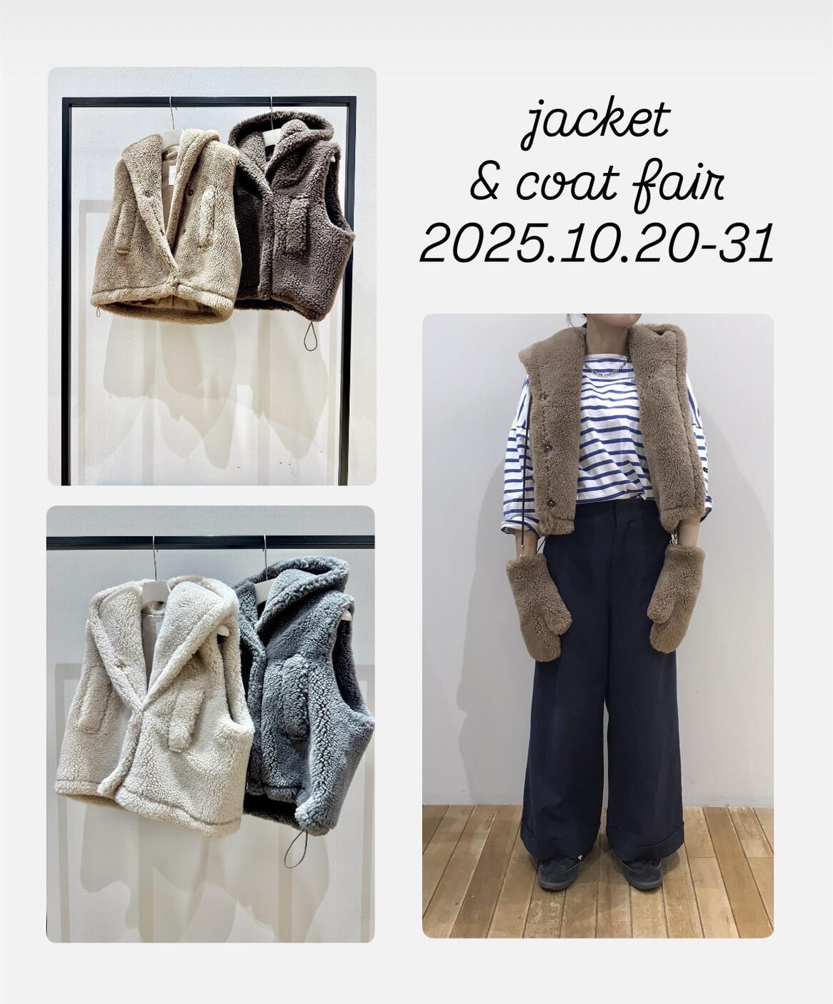 こちらのベストも只今開催中のジャケット・コートフェアの対象アイテムとなっておりますので、ぜひ店頭でご覧くださいませ^^