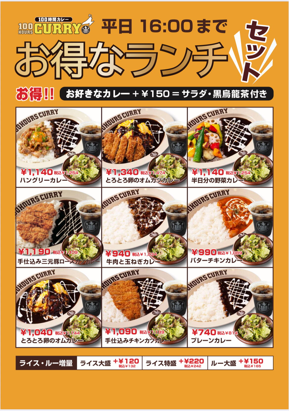 100時間カレーではランチタイム限定でお得なセットを販売中です!!