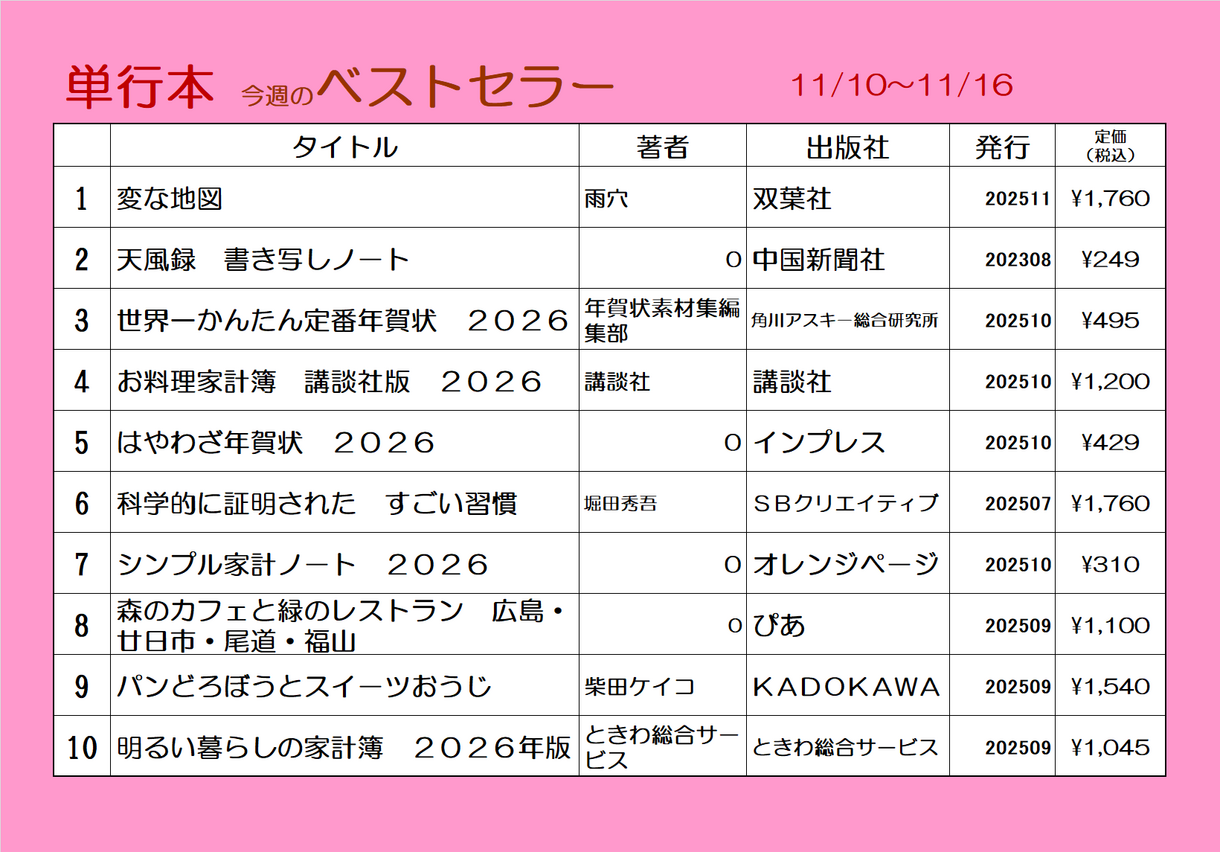 紀伊國屋書店ゆめタウン広島店の先週の売上ランキングを発表します!