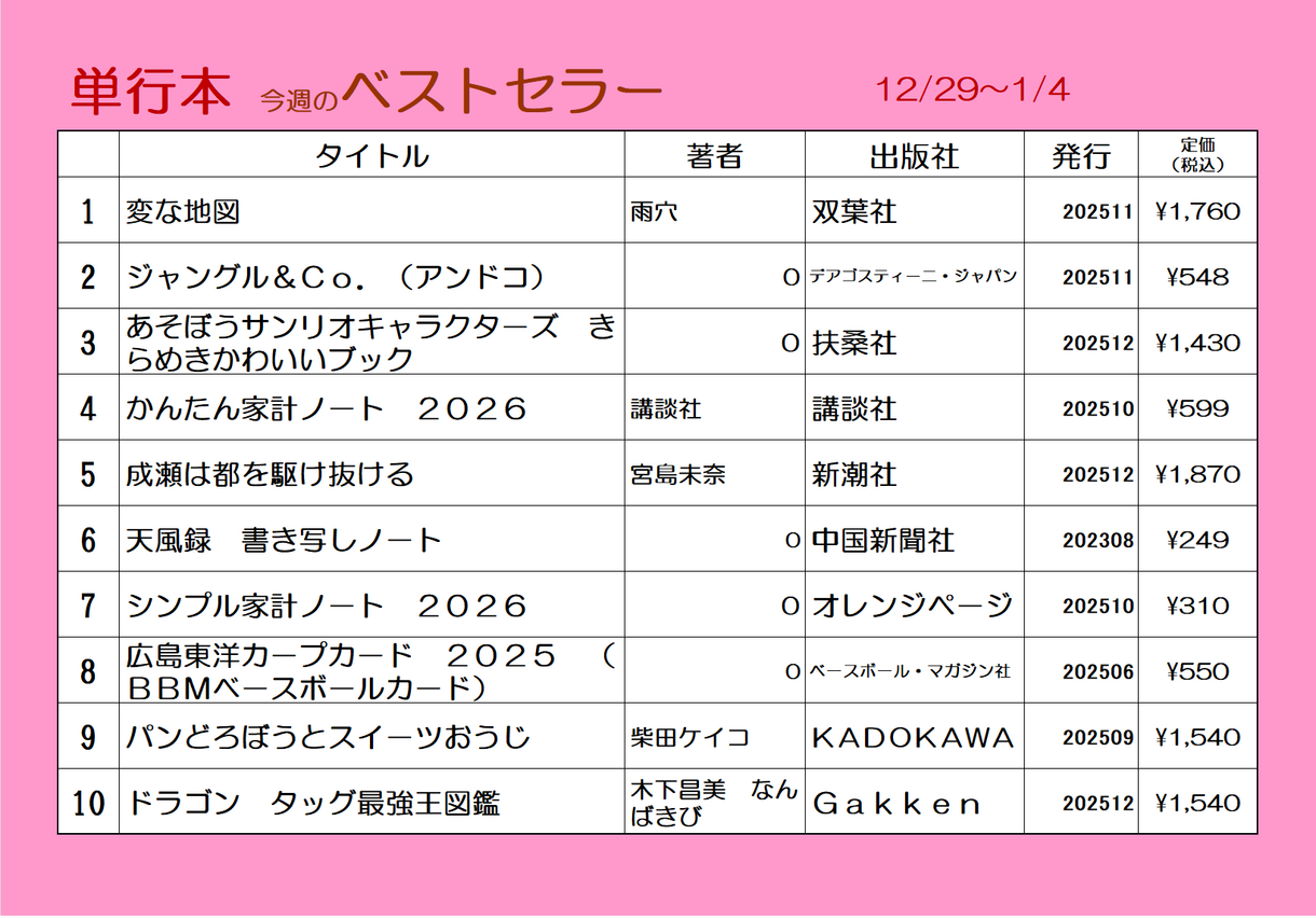 紀伊國屋書店ゆめタウン広島店の先週の売上ランキングを発表します!