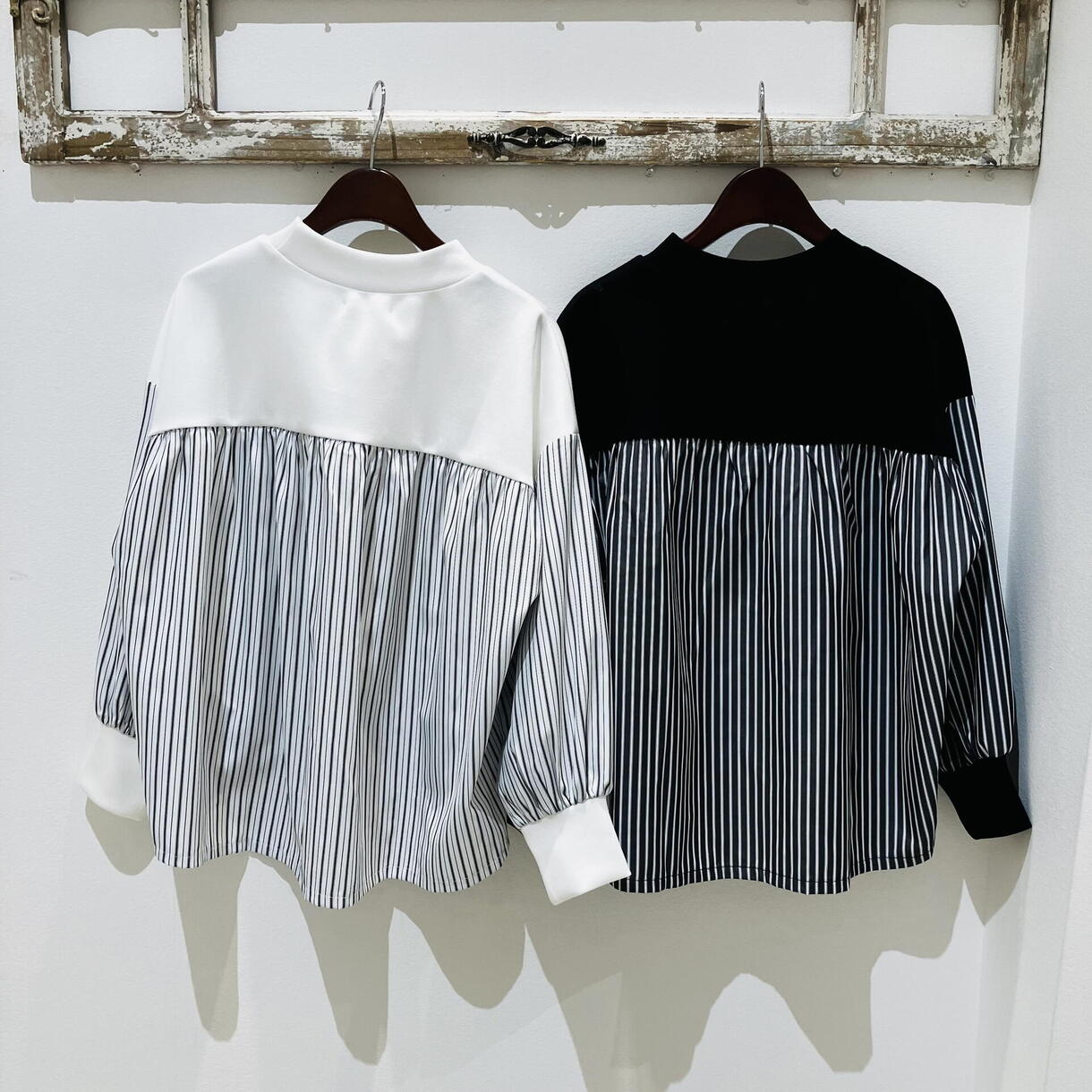 柔らかなダンボール素材と涼しげなストライプ柄のシャツを組み合わせた異素材ドッキングプルオーバー。後ろ丈がお尻までしっかり隠れるのも嬉しいポイント!!一枚で着るのもよし、長めなインナーを入れてレイヤード楽しむのも良し◎