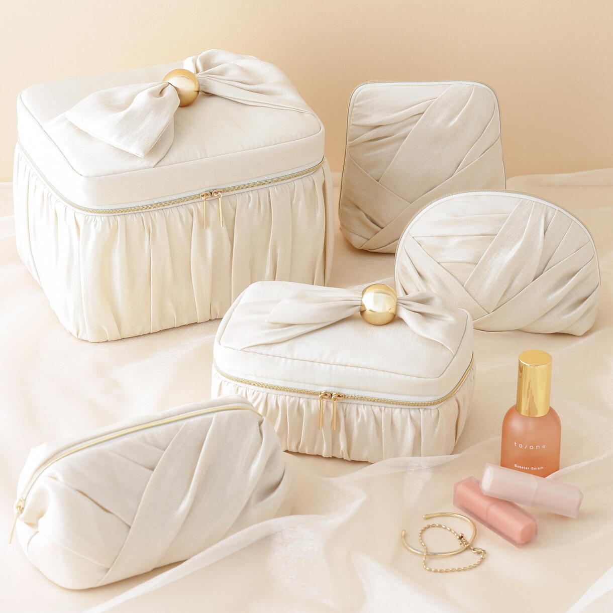 パールのような優しい光沢感のある生地を、つぼみに見立てたギャザーのデザインで大人っぽく仕上げたポーチ。
