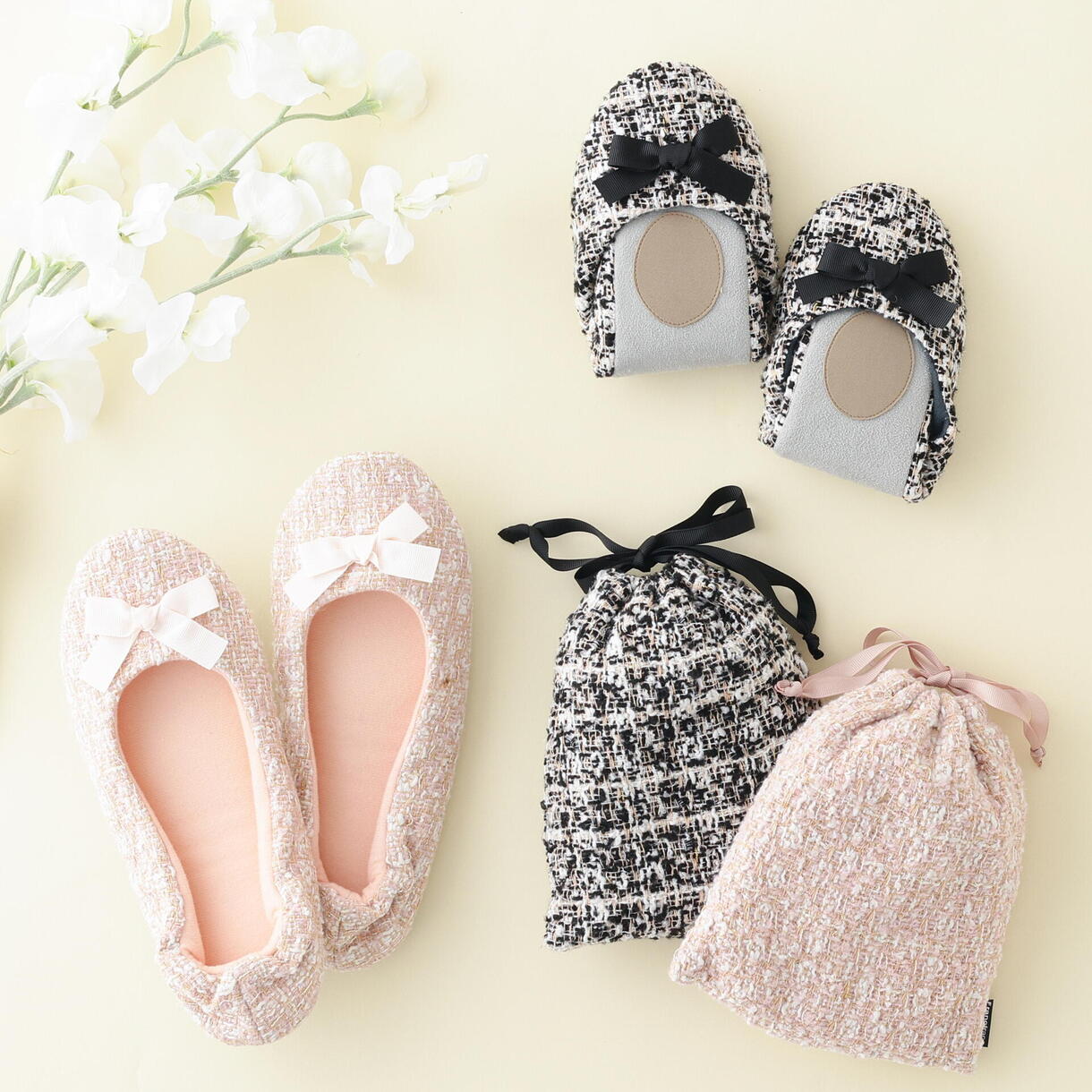 付属のポーチにコンパクトに収納出来るので、荷物がかさばることなく持ち運びに便利!着脱しやすく、フラットなシューズなので長時間の移動の際にもおすすめです。ライブ中の室内履きにも♪