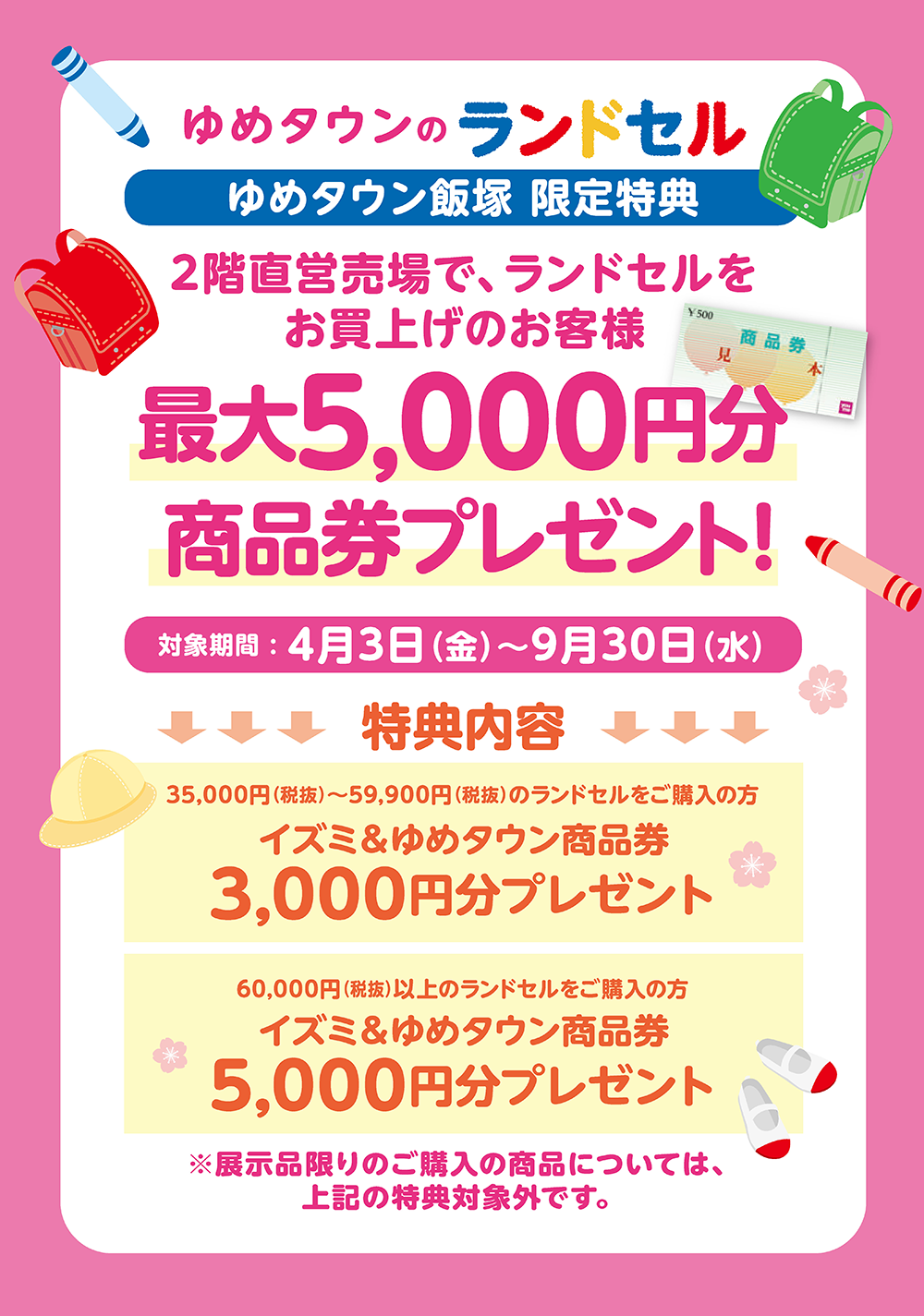 売価35,000円(税抜)~59,900円(税抜)のランドセルをご購入のお客様に、3,000円分のイズミ&ゆめタウン商品券プレゼント!