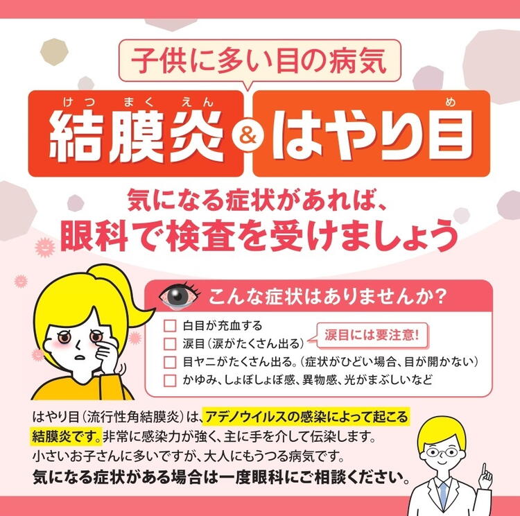 疲れ目、アレルギー(花粉症、結膜炎)、学校検診、眼鏡処方、コンタクトレンズ処方、ドライアイ、目の充血、ものもらい、白内障、緑内障、簡易アレルギー検査、眼科ドック