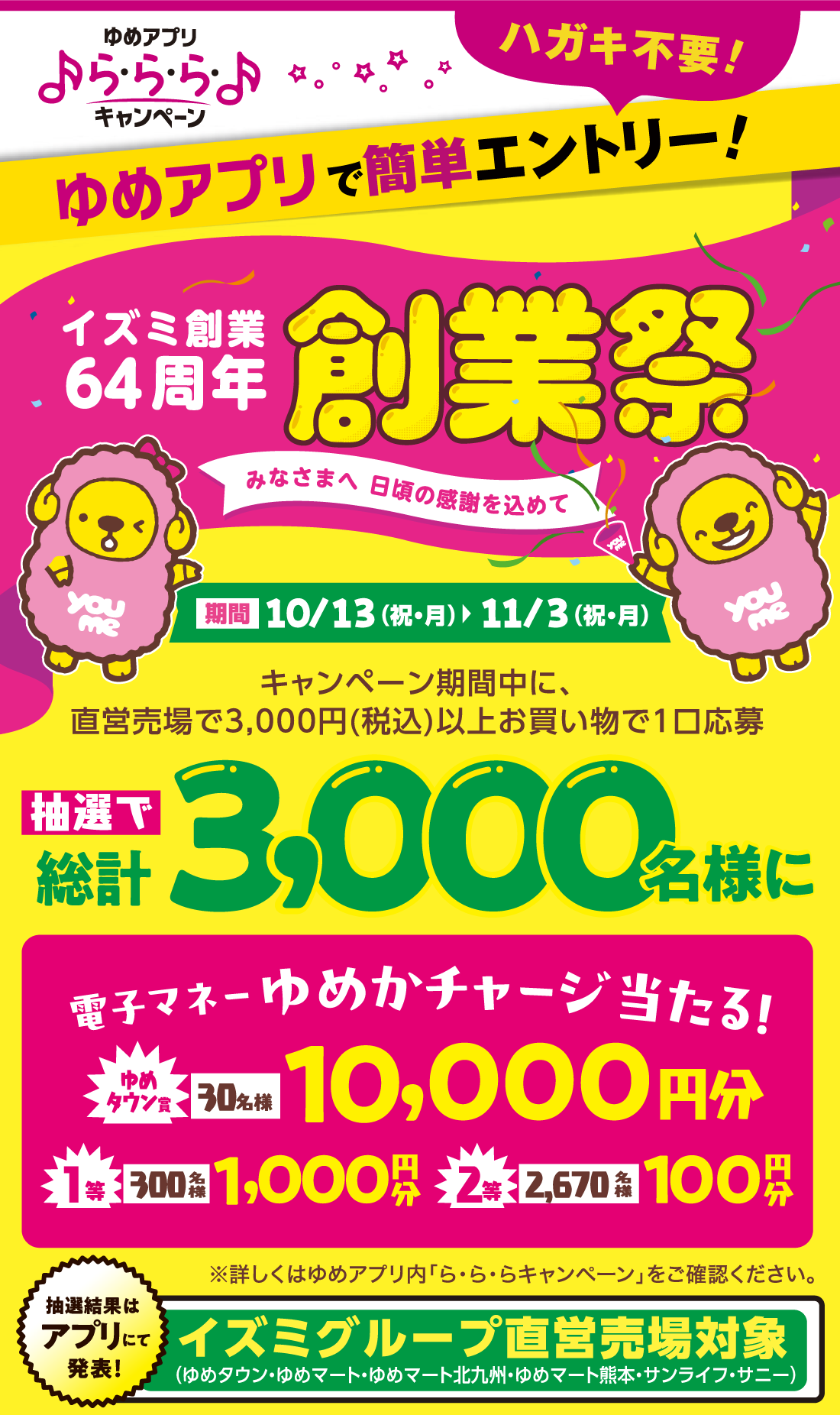 【ゆめアプリ ら・ら・ら・キャンペーン】『イズミ創業64周年 創業祭』電子マネーゆめかチャージが当たる!
