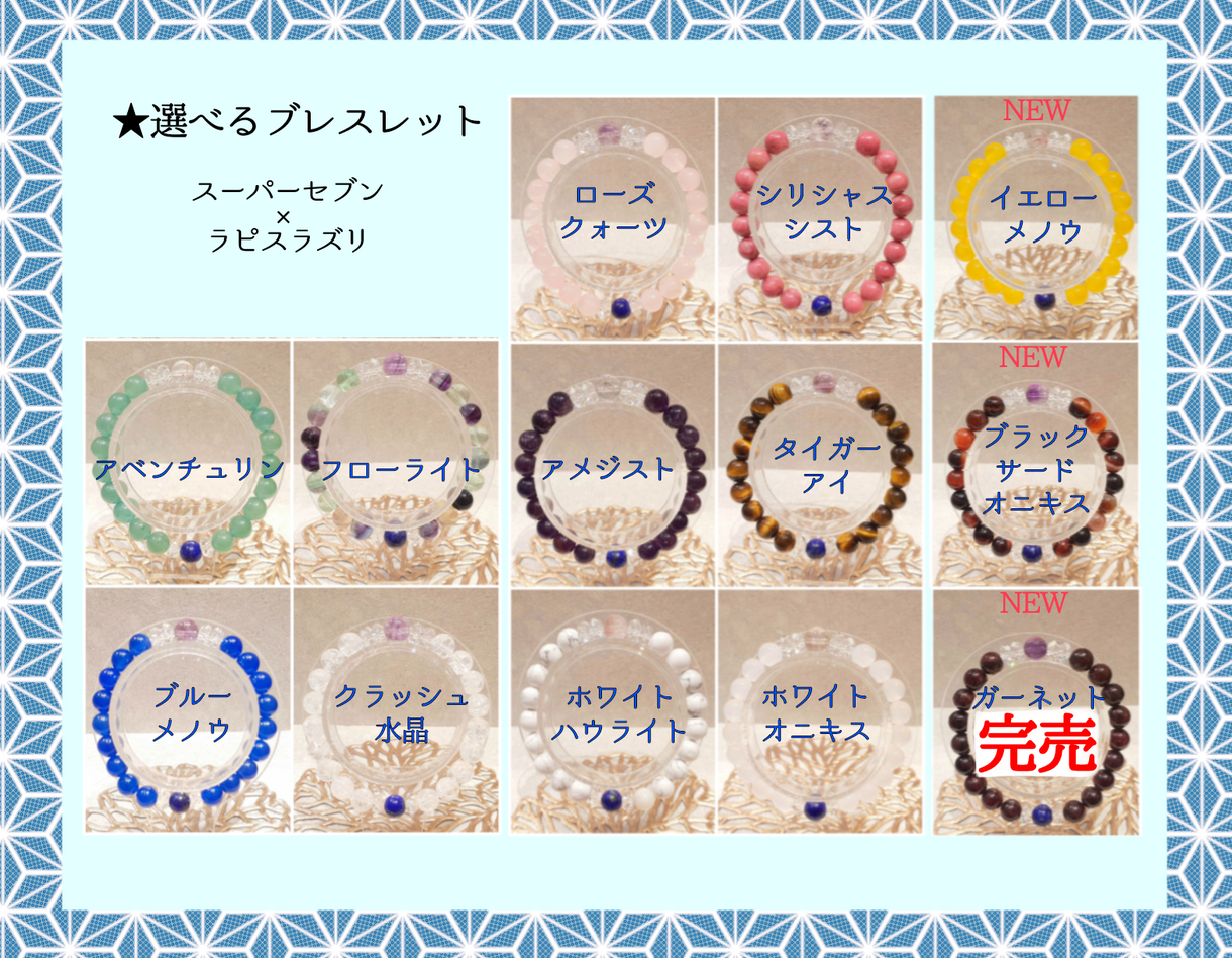 全てのブレスレットにスーパーセブンとラピスラズリが入ったブレスレットです