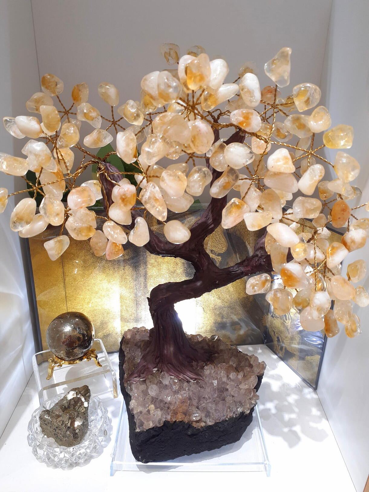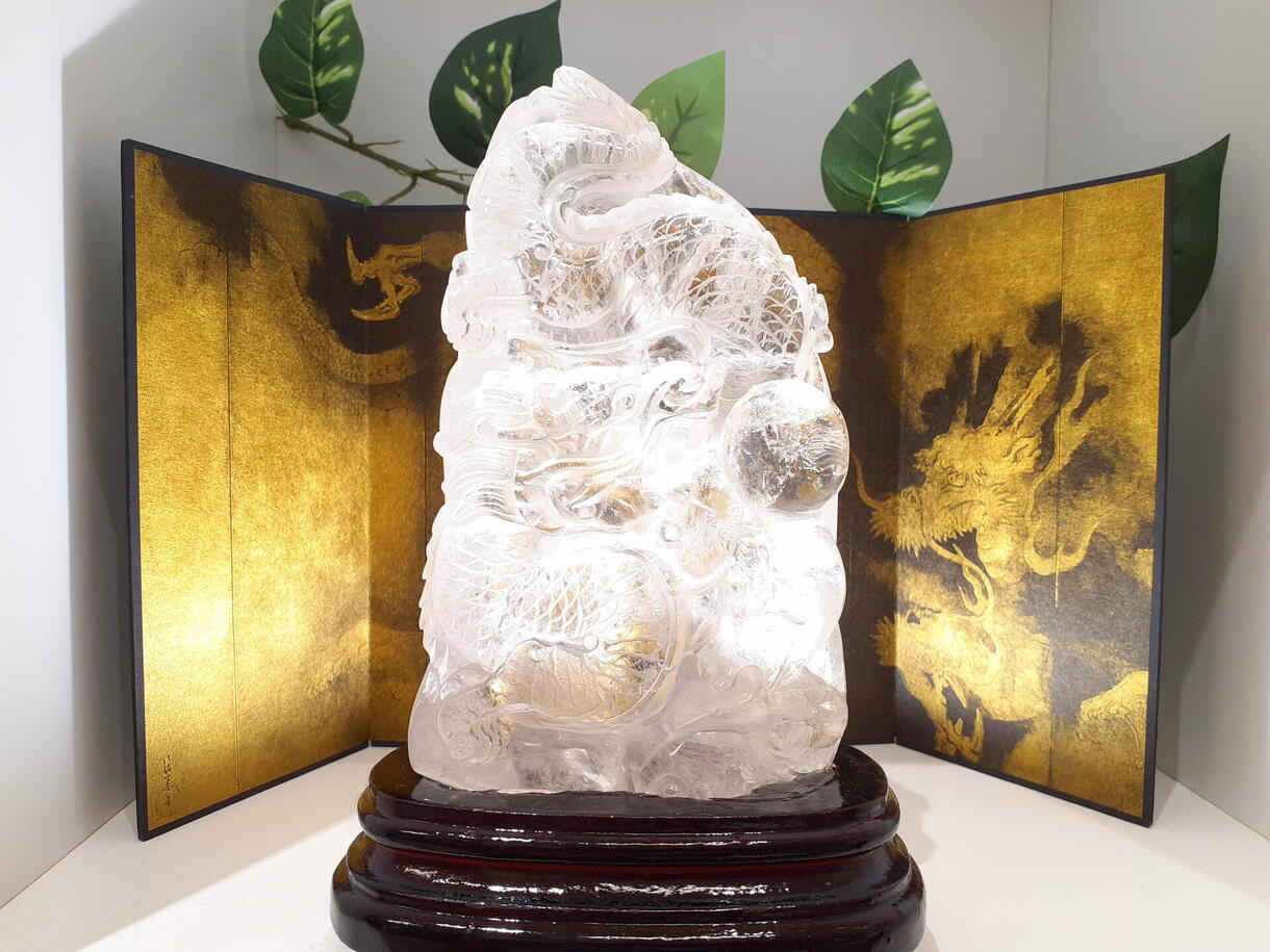 水晶龍の彫刻や、シトリンのジェムツリーなど、金運財運や経営のお守りにオススメのお石も!