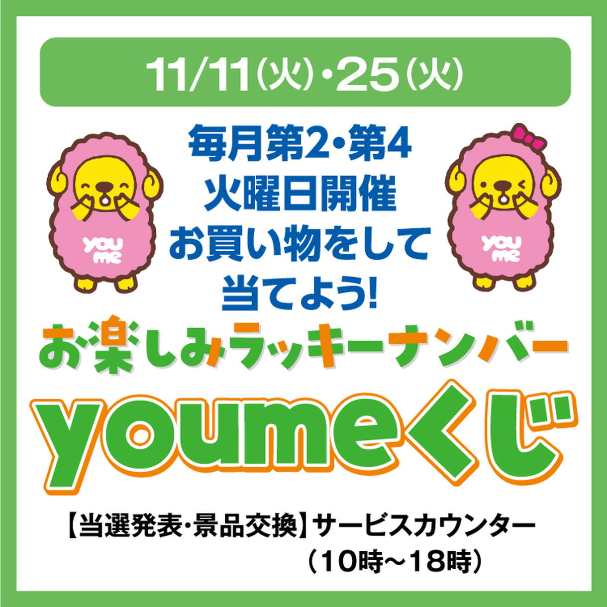 毎月第2・第4火曜日開催 お買い物をして当てよう! お楽しみラッキーナンバー youmeくじ