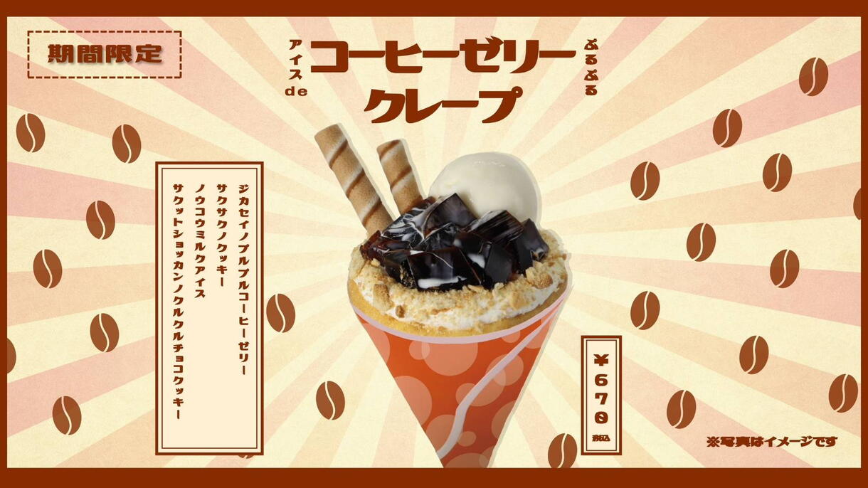 まだまだ暑い日が続くそんな時は、冷たいアイスの入ったクレープはいかがですか?つるっとほろ苦いコーヒーゼリーとミルクアイスは間違いない美味しさ!!ぜひ食べて見てください!
