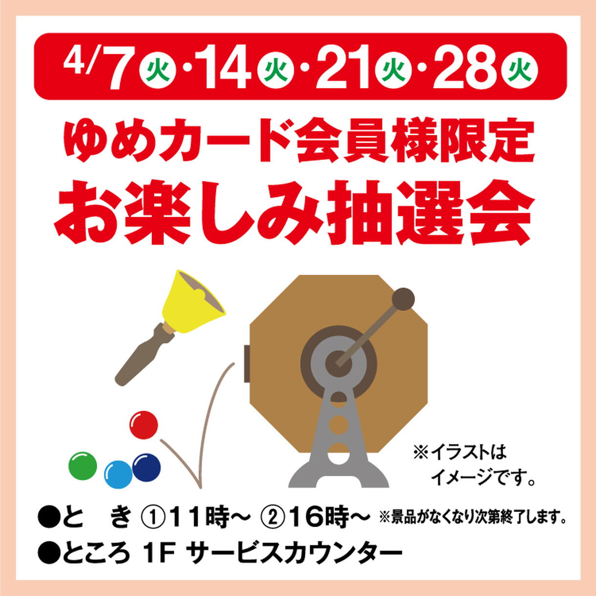 当日の館内食品売場での1,000円(税込)以上のお買い上げレシートとお手持ちのゆめカードを会場にご持参ください。